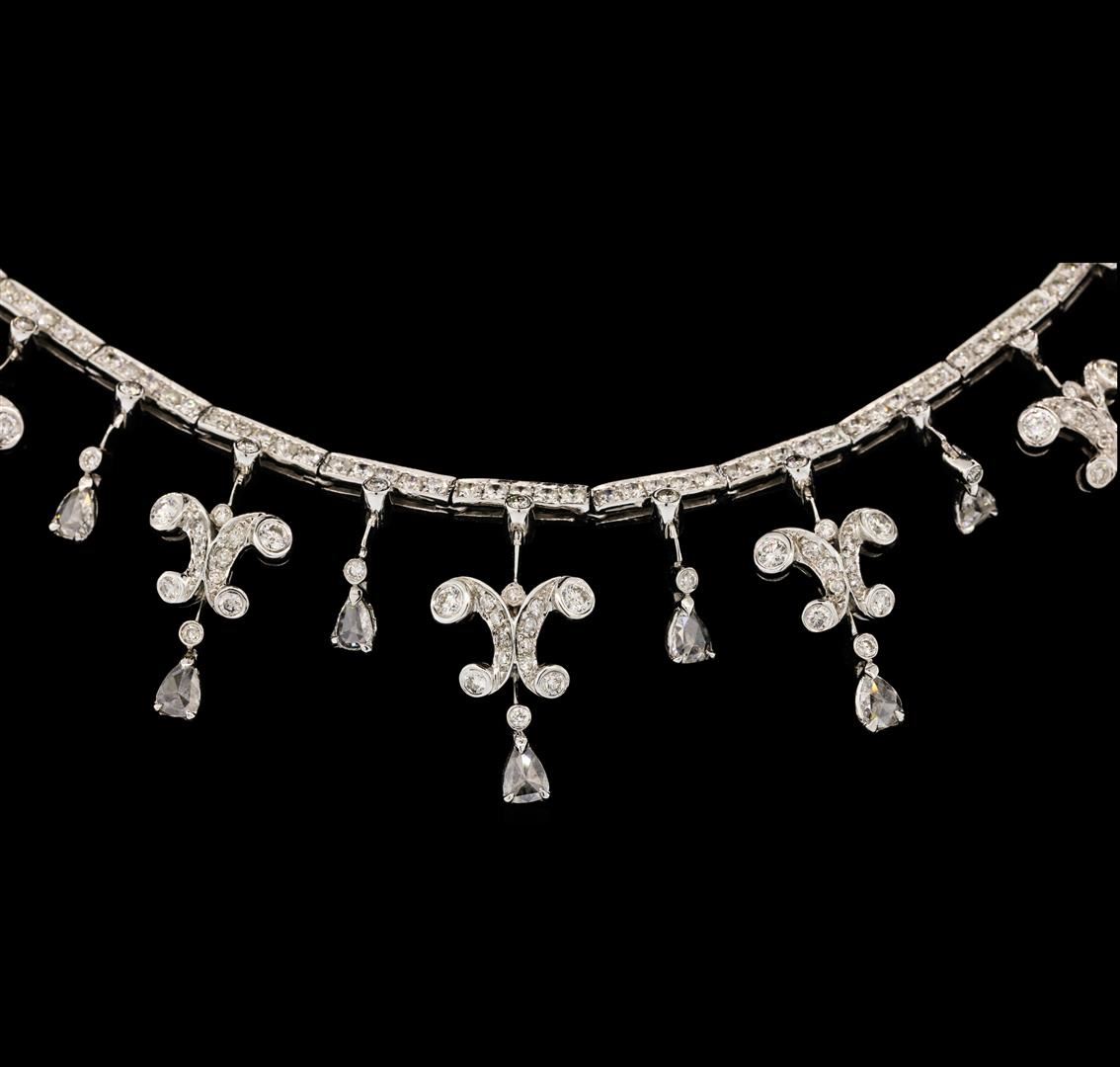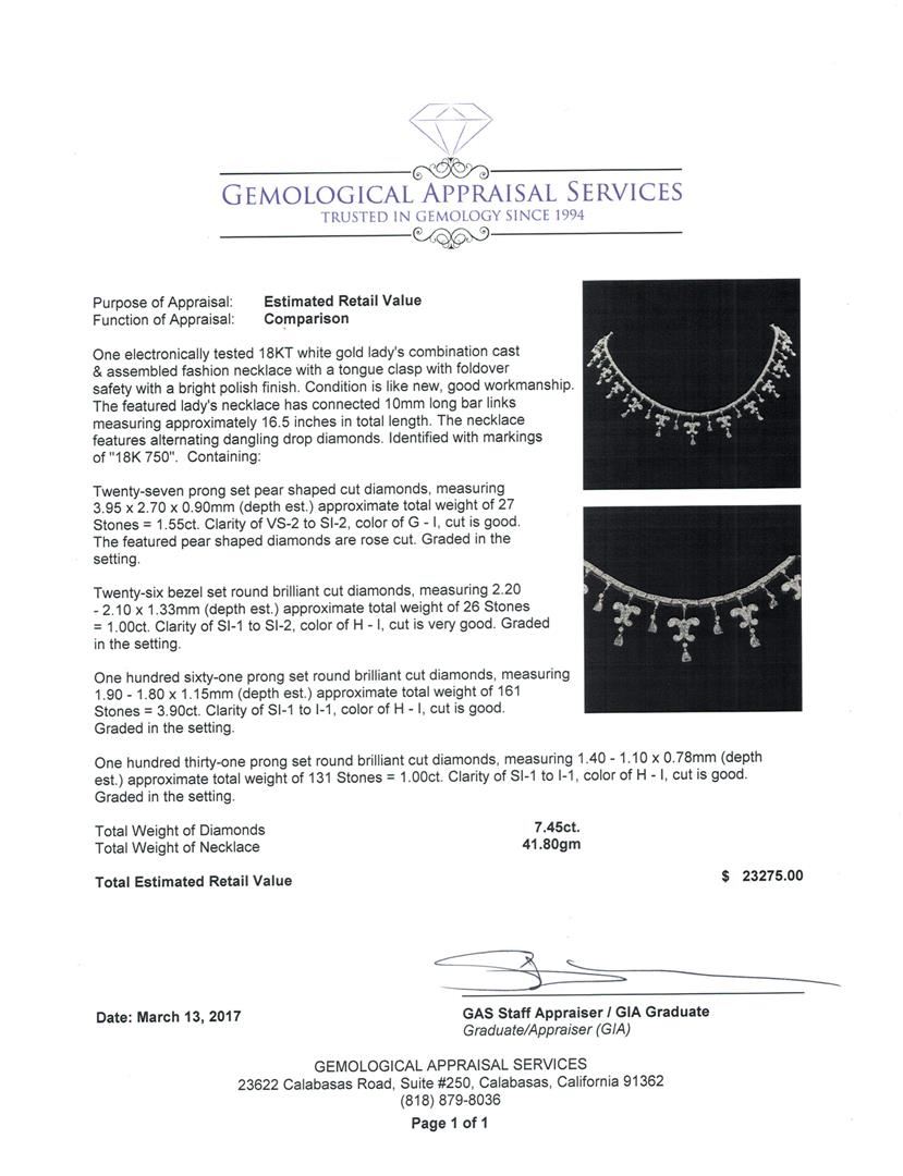 One electronically tested 18KT white gold lady's combination cast & assembled fashion necklace with a tongue clasp with foldover safety with a bright polish finish. The featured lady's necklace has connected 10mm long bar links measuring approximately 16.5 inches in total length. The necklace features alternating dangling drop diamonds. Identified with markings of '18K 750'. Condition is like new, good workmanship. Containing: Twenty-Seven prong set pear shaped cut diamonds, measuring 3.95 x 2.70 x 0.90mm (depth est.) approximate total weight of 27 Stones = 1.55ct. The featured pear shaped diamonds are rose cut. Graded in the setting. Color G - I Clarity VS-2 to SI-2 Cut Good Twenty-Six bezel set round brilliant cut diamonds, measuring 2.20 - 2.10 x 1.33mm (depth est.) approximate total weight of 26 Stones = 1.00ct. Graded in the setting. Color H - I Clarity SI-1 to SI-2 Cut Very Good One Hundred Sixty-One prong set round brilliant cut diamonds, measuring 1.90 - 1.80 x 1.15mm (depth est.) approximate total weight of 161 Stones = 3.90ct. Graded in the setting. Color H - I Clarity SI-1 to I-1 Cut Good One Hundred Thirty-One prong set round brilliant cut diamonds, measuring 1.40 - 1.10 x 0.78mm (depth est.) approximate total weight of 131 Stones = 1.00ct. Graded in the setting. Color H - I Clarity SI-1 to I-1 Cut Good. Total Weight of Diamonds 7.45ct.. Total Weight of Necklace 41.80gm GAS Appraised at $23,275.00.