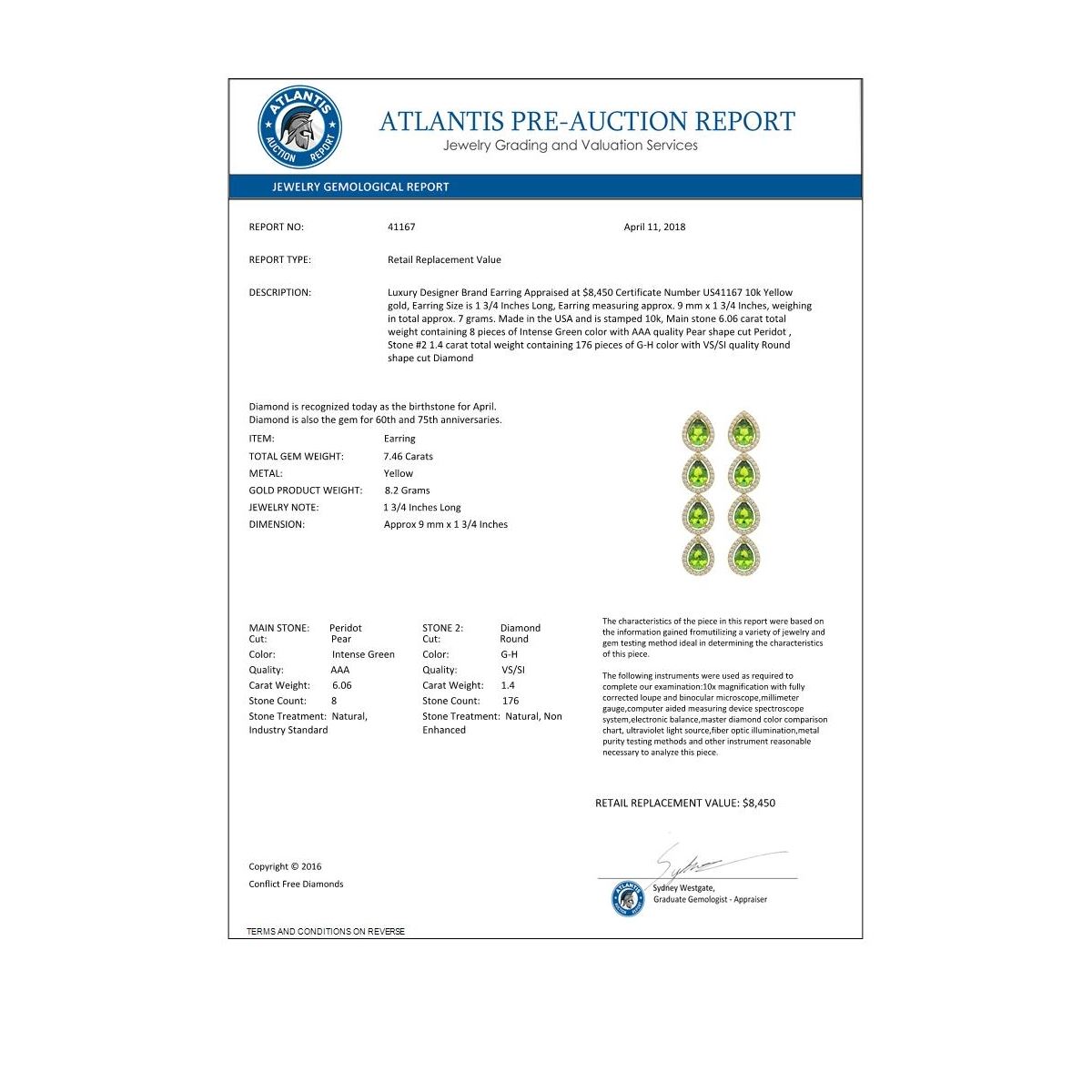 REF-153K5W -41167 ---- 7.46 CTW Peridot & Diamond Halo Earrings 10K Yellow Gold ---- Luxury Designer Brand Earring Appraised at $8,450 Certificate Number US41167 10k Yellow gold, Earring Size is 1 3/4 Inches Long, Earring measuring approx. 9 mm x 1 3/4 Inches, weighing in total approx. 7 grams. Made in the USA and is stamped 10k, Main stone 6.06 carat total weight containing 8 pieces of Intense Green color with AAA quality Pear shape cut Peridot , Stone #2 1.4 carat total weight containing 176 pieces of G-H color with VS/SI quality Round shape cut Diamond
