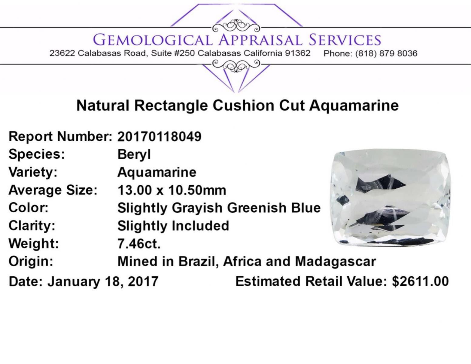 One natural rectangle cushion cut aquamarine with an exact weight of 7.46ct., clarity is slightly included, slightly grayish greenish blue. Gemological Appraisals Services estimates the retail value at $2611 GAS Appraised.