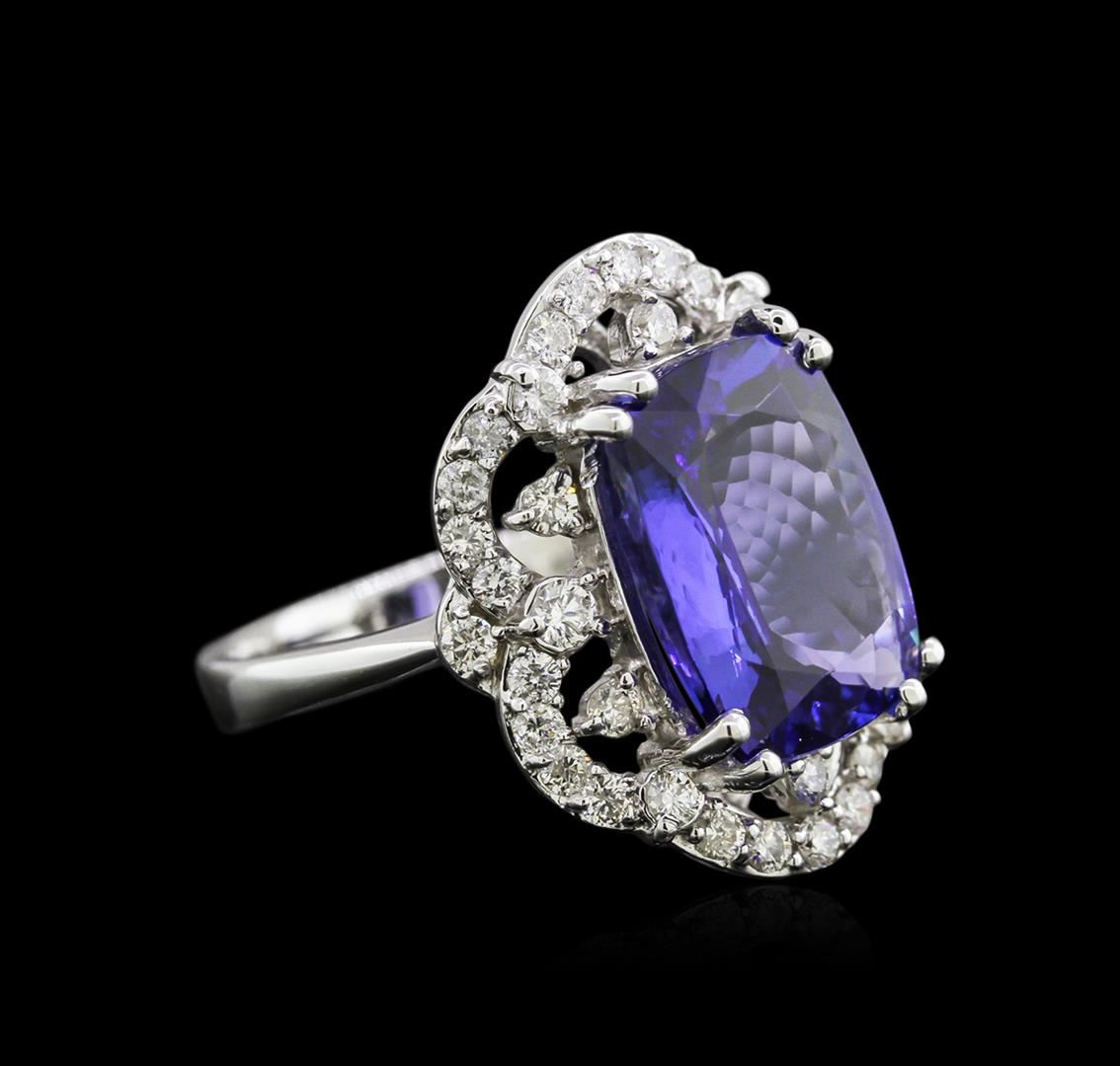 One electronically tested 14KT white gold lady's cast fashion ring with a cathedral shank with a bright polish finish. The featured lady's ring has a scalloped halo motif with a shank measuring 3.05 millimeters wide. Identified with markings of "K14". Condition is new, good workmanship. Containing: One prong set rectangular cushion modified brilliant cut natural tanzanite, measuring 14.00 x 10.46 x 6.00mm, 8% bulge factor, approximate weight of 7.47ct., clarity is eye clean, type I, medium dark, very slightly grayish, violetish blue color, (GIA vB 6/3), cut is very good. Transmitting light with no distortion, transparent. Colored gemstones are presumed to have been subjected to commonly used enhancement processes. Graded in the setting. Two prong set round brilliant cut diamonds, measuring 2.50 - 2.45 x 1.61mm (depth est.) approximate total weight of 2 Stones = 0.12ct. Graded in the setting. Clarity: SI-2 to I-1. Color: Good Thirty-Eight prong set round brilliant cut diamonds, measuring 1.90 - 1.80 x 1.11mm (depth est.) approximate total weight of 38 Stones = 0.86ct. Graded in the setting. Clarity: SI-2 to I-1. Color: H - I. Cut Good. Total Weight of Colored Stones 7.47ct. Total Weight of Diamonds 0.98ct. Total Weight of Ring 8.20gm. GAS Appraised at $19,115.00.