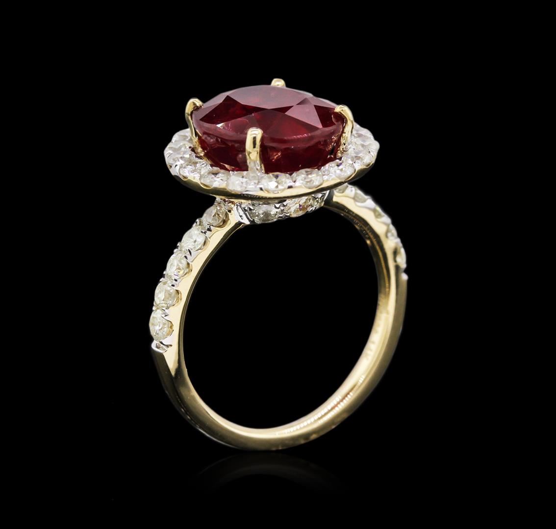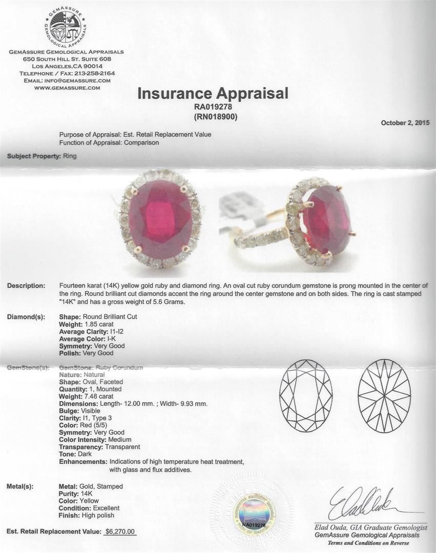 Fourteen karat (14K) yellow gold ruby and diamond ring. An oval cut ruby corundum gemstone is prong mounted in the center of the ring. Round brilliant cut diamonds accent the ring around the center gemstone and on both sides. The ring is cast stamped "14K GGA Appraised.