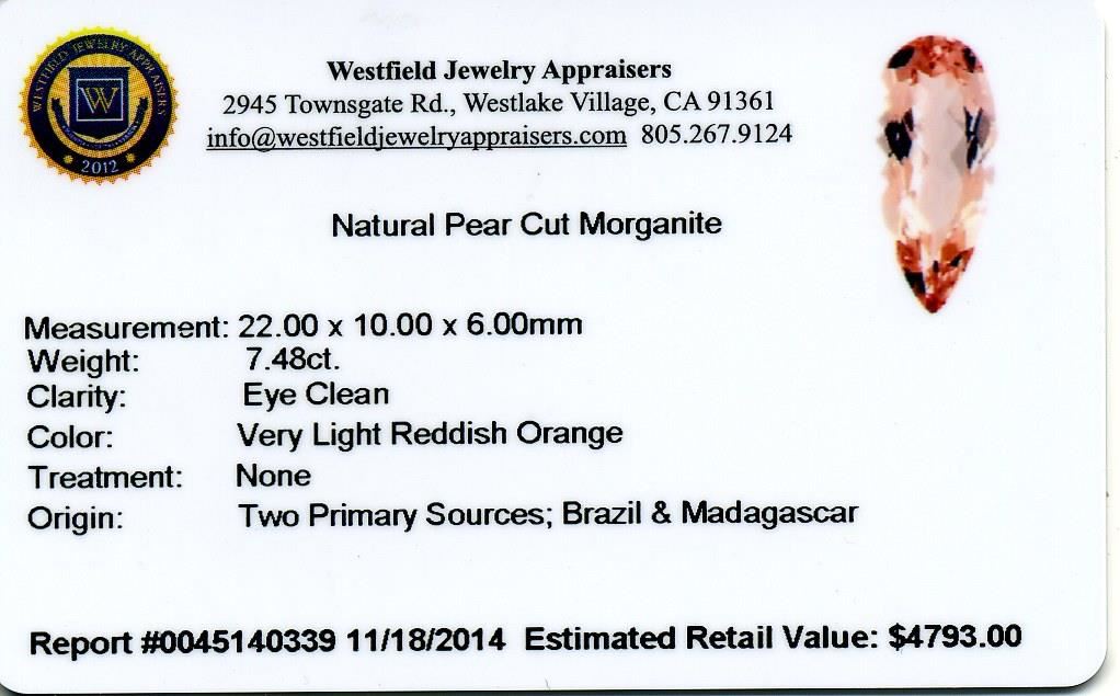 7.48ctw. Natural Pear Cut Morganite. Westfield Appraised at $4,793.00.