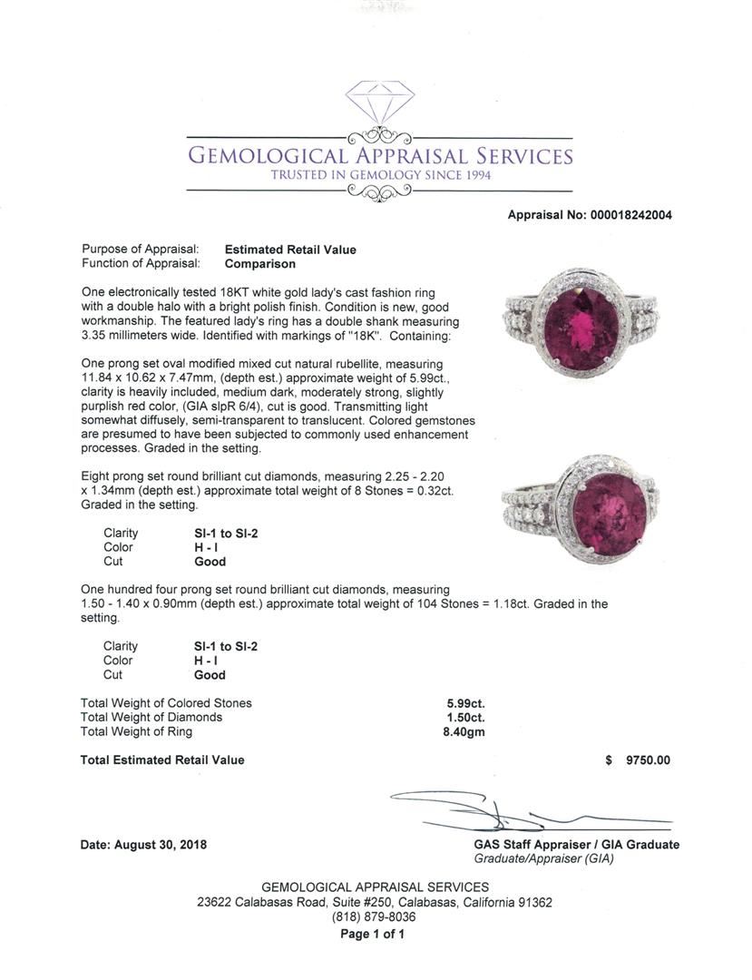 One electronically tested 18KT white gold lady's cast fashion ring with a double halo with a bright polish finish. The featured lady's ring has a double shank measuring 3.35 millimeters wide. Identified with markings of '18K'. Condition is new, good workmanship. Containing: One prong set oval modified mixed cut natural rubellite, measuring 11.84 x 10.62 x 7.47mm, (depth est.) approximate weight of 5.99ct., clarity is heavily included, medium dark, moderately strong, slightly purplish red color, (GIA slpR 6/4), cut is good. Transmitting light somewhat diffusely, semi-transparent to translucent. Colored gemstones are presumed to have been subjected to commonly used enhancement processes. Graded in the setting. Eight prong set round brilliant cut diamonds, measuring 2.25 - 2.20 x 1.34mm (depth est.) approximate total weight of 8 Stones = 0.32ct. Graded in the setting. Color H - I Clarity SI-1 to SI-2 Cut Good One Hundred Four prong set round brilliant cut diamonds, measuring 1.50 - 1.40 x 0.90mm (depth est.) approximate total weight of 104 Stones = 1.18ct. Graded in the setting. Color H - I Clarity SI-1 to SI-2 Cut Good. Total Weight of Colored Stones 5.99ct.. Total Weight of Diamonds 1.50ct.. Total Weight of Ring 8.40gm GAS Appraised at $9750.00. GAS Appraised.