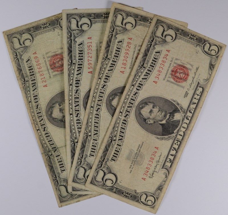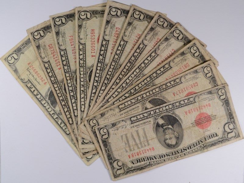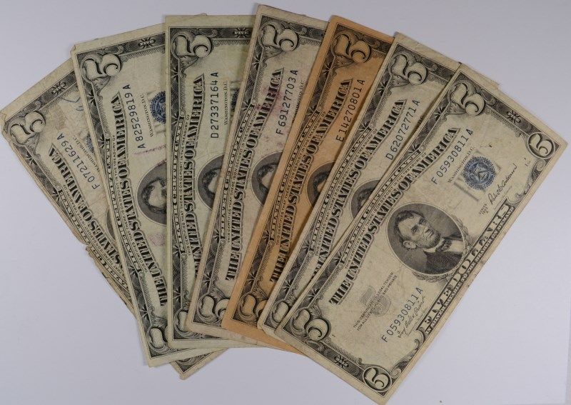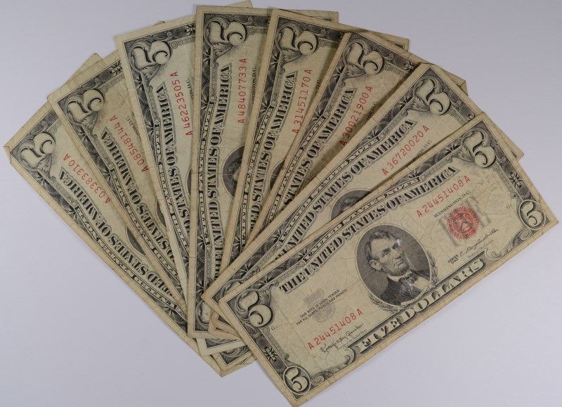 ( 7 ) $5.00 SILVER CERTS. AND ( 23 ) $5.00 RED SEAL NOTES, AVE. CIRCULATED