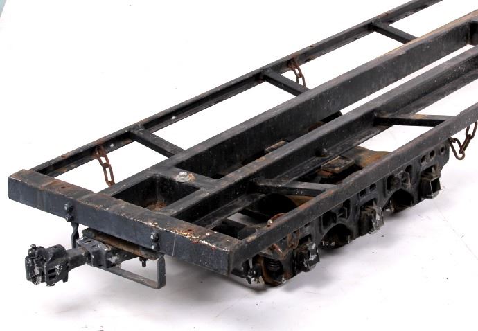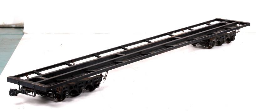 This is a 7.5" gauge live steam railroad rolling chassis with frame and trucks. This came from the James Edgerley collection of the OR&W Railroad in Bozeman, Montana. The trucks feature triple axles and the frame is well built. There are couplers at each end. The chassis shows good condition. It measures 16.5" wide and 128" long.