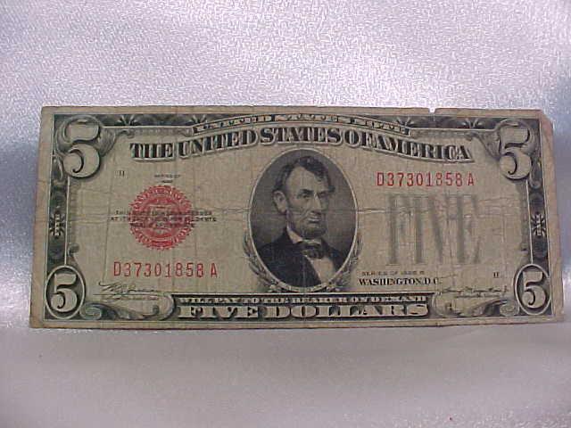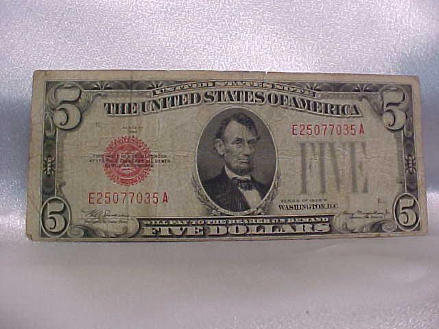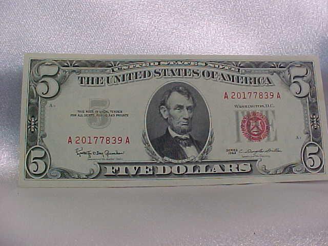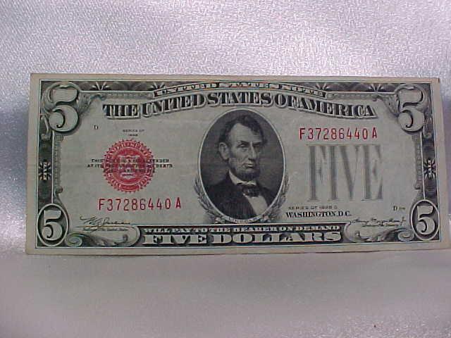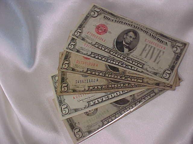 7-$5 Mix: 5 USN (2-28B VG, F; 2-28C F, VF; 63 CHCU); 1934A Silver Certificate G; FRN 1934A Chicago F