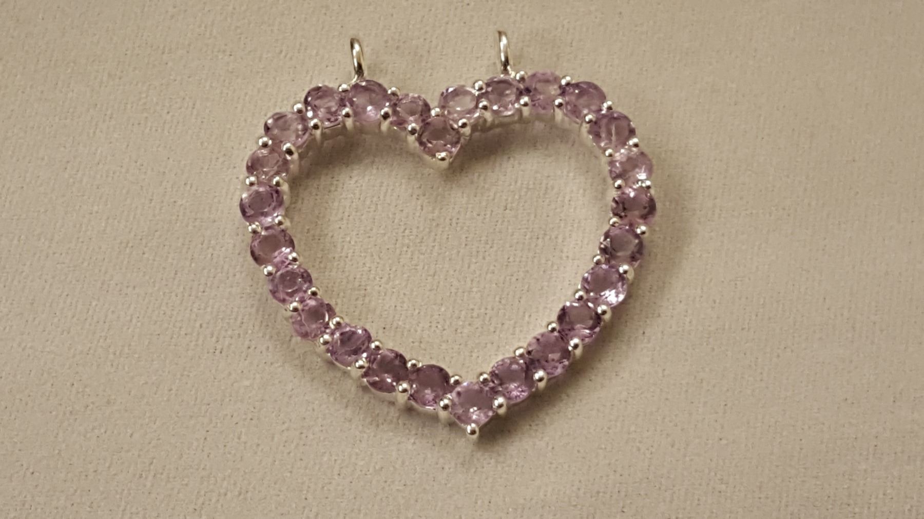 PRETTY SPARKLING 7.50 CT PINK ROSE DE FRANCE AMETHYST HEART PENDANT. THESE NEAR FLAWLESS GEMSTONES ARE MOUNTED IN SOLID .925 STERLING SILVER. 20 CTTW OR 4 GRAMS