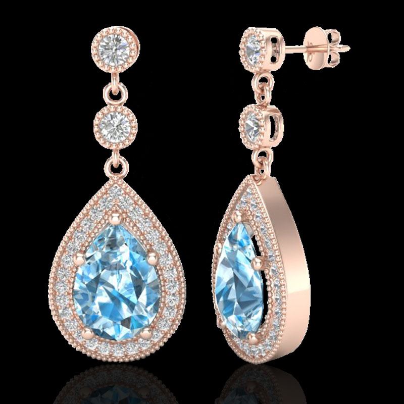 REF-63H3A -23125 ---- 7.50 CTW Sky Topaz & Micro Pave VS/SI Diamond Earrings Designer 14K Rose Gold ---- Luxury Designer Brand Earring Appraised at $4,500 Certificate Number US23125 14k Rose gold, Earring Size is 3/8 Inches, Earring measuring approx. 3/8" x 3/4" , weighing in total approx. 3.8 grams. Made in the USA and is stamped 14k, Main stone 6.98 carat total weight containing 2 pieces of Translucent Sky Blue color with AAA quality Pear shape cut Topaz , Stone #2 0.52 carat total weight containing 50 pieces of H-I color with VS/SI quality Round shape cut Diamond