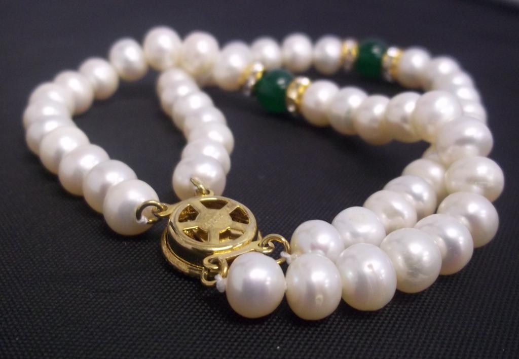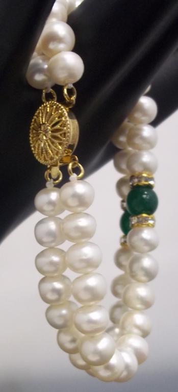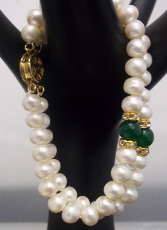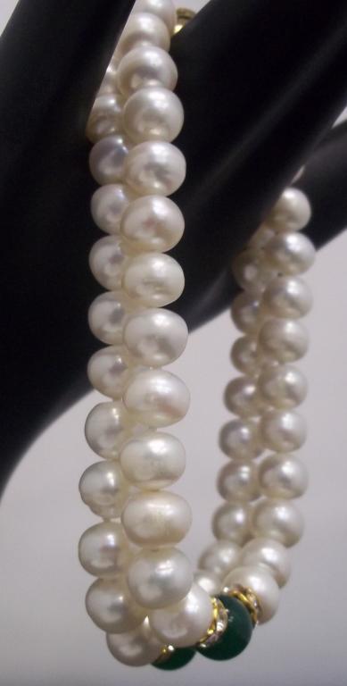 Two beautiful strands of 8mm fresh water pearls with just a couple green beads and four roundells to give the perfect accent to this beauty. Retail value is $$256-.