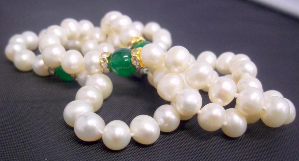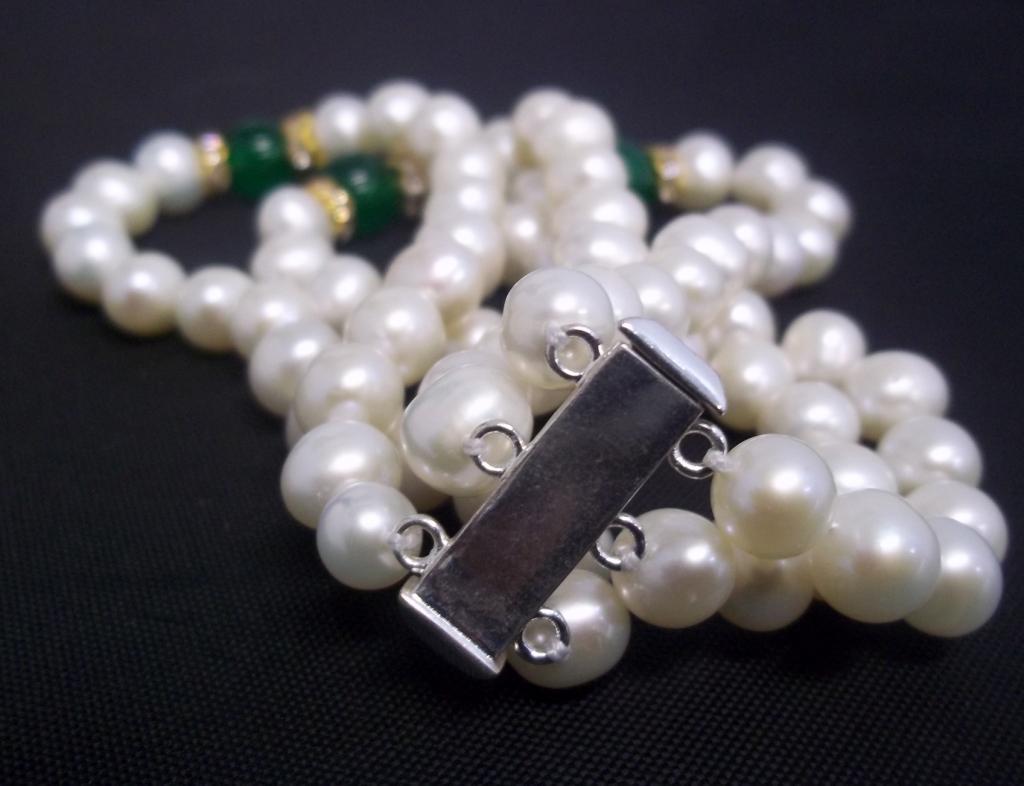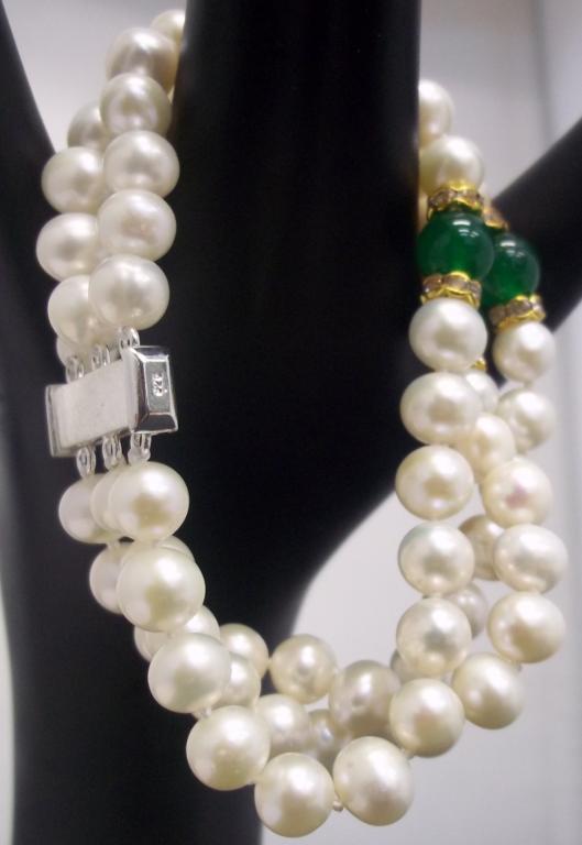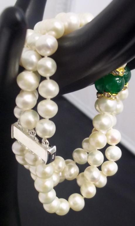 This gorgeous bracelet is made with three strand of 8mm fresh water pearls accented with roundells and green beads. Retail value $1020-,