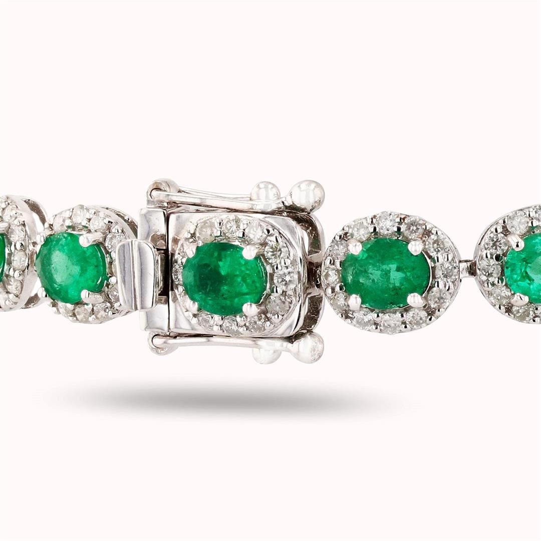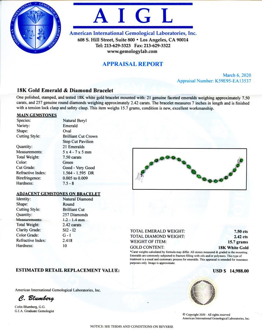 18K Gold Emerald and Diamond Bracelet One polished, stamped, and tested 18K white gold bracelet mounted with: 21 genuine faceted emeralds weighing approximately 7.50 carats, and 257 genuine round diamonds weighing approximately 2.42 carats. The bracelet measures 7 inches in length and is finished with a tension lock clasp and safety clasp. This item weighs 15.7 grams, condition is new, excellent workmanship. MAIN GEMSTONES Species: Natural Beryl Variety: Emerald Shape: Oval Cutting Style: Brilliant Cut Crown Step Cut Pavilion Quantity: 21 Emeralds Measurements: 5 x 4 - 7 x 5 mm Total Weight: 7.50 carats Color: Green Cut Grade: Good - Very Good Refractive Index: 1.564 - 1.595 DR Birefringence: 0.005 to 0.009 Hardness: 7.5 - 8 ADJACENT GEMSTONES ON BRACELET Identity: Natural Diamond Shape: Round Cutting Style: Brilliant Cut Quantity: 257 Diamonds Measurements: 1.2 - 1.4 mm Total Weight: 2.42 carats Clarity Grade: SI-2 to I-2 Color Grade: G-I Refractive Index: 2.418 Hardness: 10 TOTAL EMERALD WEIGHT: 7.50 cts TOTAL DIAMOND WEIGHT: 2.42 cts WEIGHT OF ITEM: 15.7 grams GOLD CONTENT: 18K White Gold
