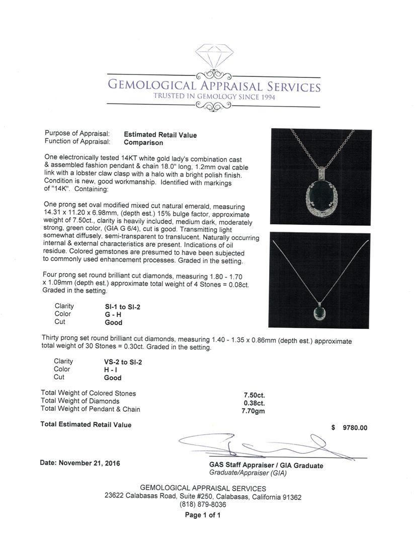 One electronically tested 14KT white gold lady's combination cast & assembled fashion pendant & chain 18.0' long, 1.2mm oval cable link with a lobster claw clasp with a halo with a bright polish finish. Identified with markings of '14K'. Condition is new, good workmanship. Containing: One prong set oval modified mixed cut natural emerald, measuring 14.31 x 11.20 x 6.98mm, (depth est.) 15%. bulge factor, approximate weight of 7.50ct., clarity is heavily included, medium dark, moderately strong, green color, (GIA G 6/4), cut is good. Transmitting light somewhat diffusely, semi-transparent to translucent. Naturally occurring internal & external characteristics are present. Indications of oil residue. Colored gemstones are presumed to have been subjected to commonly used enhancement processes. Graded in the setting. Four prong set round brilliant cut diamonds, measuring 1.80 - 1.70 x 1.09mm (depth est.) approximate total weight of 4 Stones = 0.08ct. Graded in the setting. Clarity SI-1 to SI-2. Color: G - H Cut Good Thirty prong set round brilliant cut diamonds, measuring 1.40 - 1.35 x 0.86mm (depth est.) approximate total weight of 30 Stones = 0.30ct. Graded in the setting. Clarity VS-2 to SI-2. Color: H - I Cut Good. Total Weight of Colored Stones 7.50ct.. Total Weight of Diamonds 0.38ct.. Total Weight of Pendant & Chain 7.70gm. GAS Appraised.