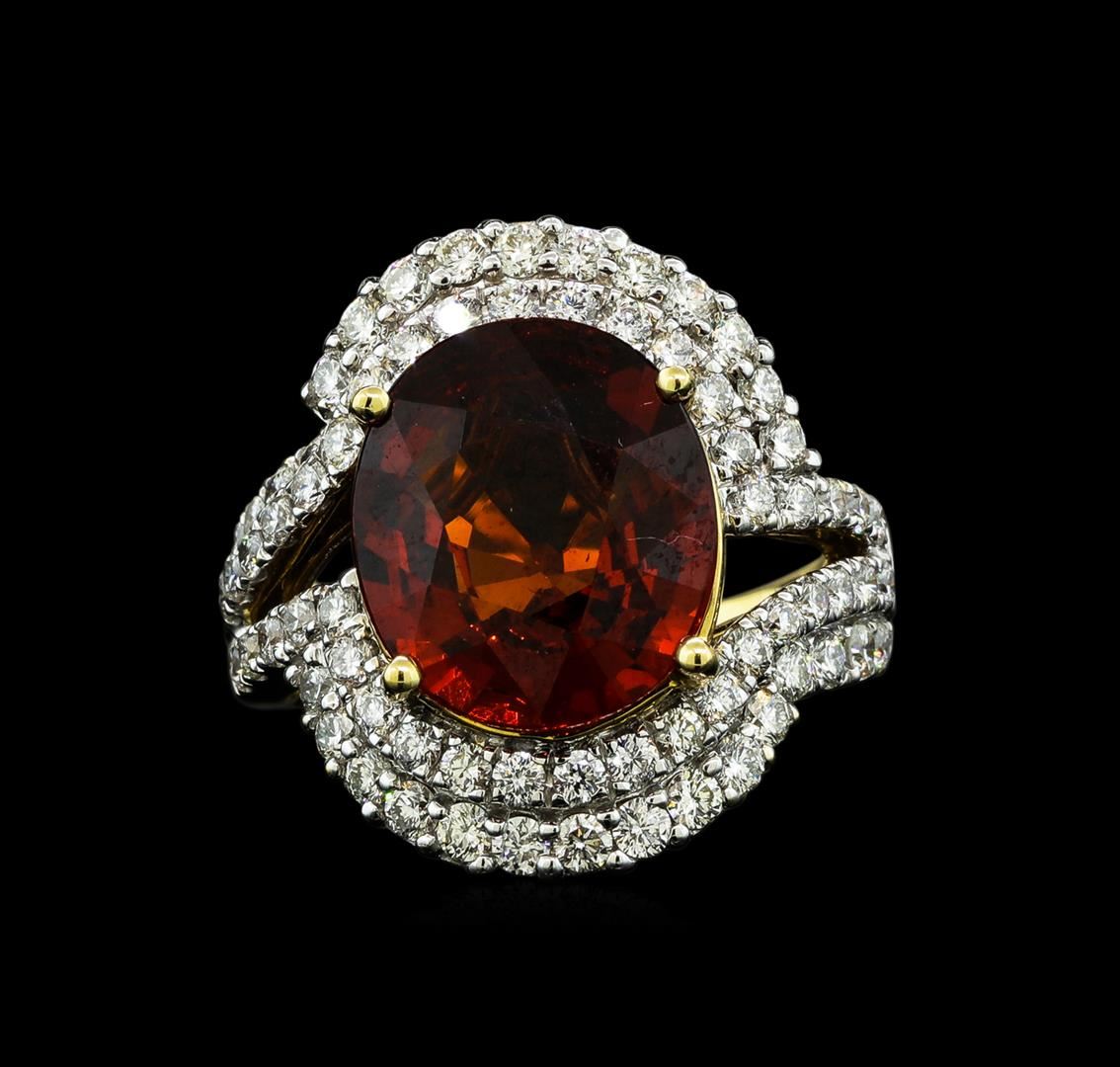 One electronically tested 14KT yellow gold lady's combination cast & assembled fashion ring with a split bypass shank with a bright polish finish. The featured lady's ring has a shank measuring 2.30 millimeters wide. Identified with markings of '14K'. Condition is new, good workmanship. Containing: One prong set oval modified mixed cut natural malaya garnet, measuring 12.93 x 11.52 x 5.68mm, (depth est.) 10%. bulge factor, approximate weight of 7.50ct., clarity is eye clean, medium dark, strong, reddish orange color, (GIA rO 6/5), cut is good. Transmitting light with no distortion, transparent. Colored gemstones are presumed to have been subjected to commonly used enhancement processes. Graded in the setting. Thirty prong set round brilliant cut diamonds, measuring 1.90 - 1.80 x 1.15mm (depth est.) approximate total weight of 30 Stones = 0.74ct. Graded in the setting. Clarity VS-2 to SI-1. Color: G - H Cut Good Forty prong set round brilliant cut diamonds, measuring 1.70 - 1.60 x 1.02mm (depth est.) approximate total weight of 40 Stones = 0.68ct. Graded in the setting. Clarity VS-2 to SI-1. Color: G - H Cut Good. Total Weight of Colored Stones 7.50ct.. Total Weight of Diamonds 1.42ct.. Total Weight of Ring 7.50gm GAS Appraised at $12,420.00.