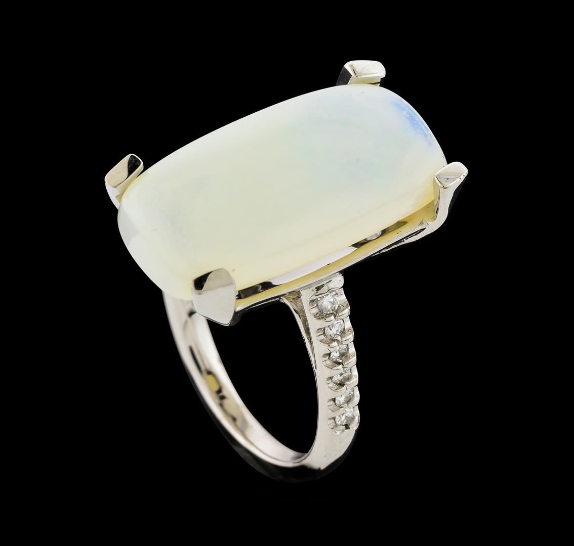 One Opal and Diamond Ring featuring: 14KT White Gold with a total weight of 6.70 grams, One Opal stone with a total weight of 7.50ct, and 12 Diamonds with a total weight of 0.18ctw.