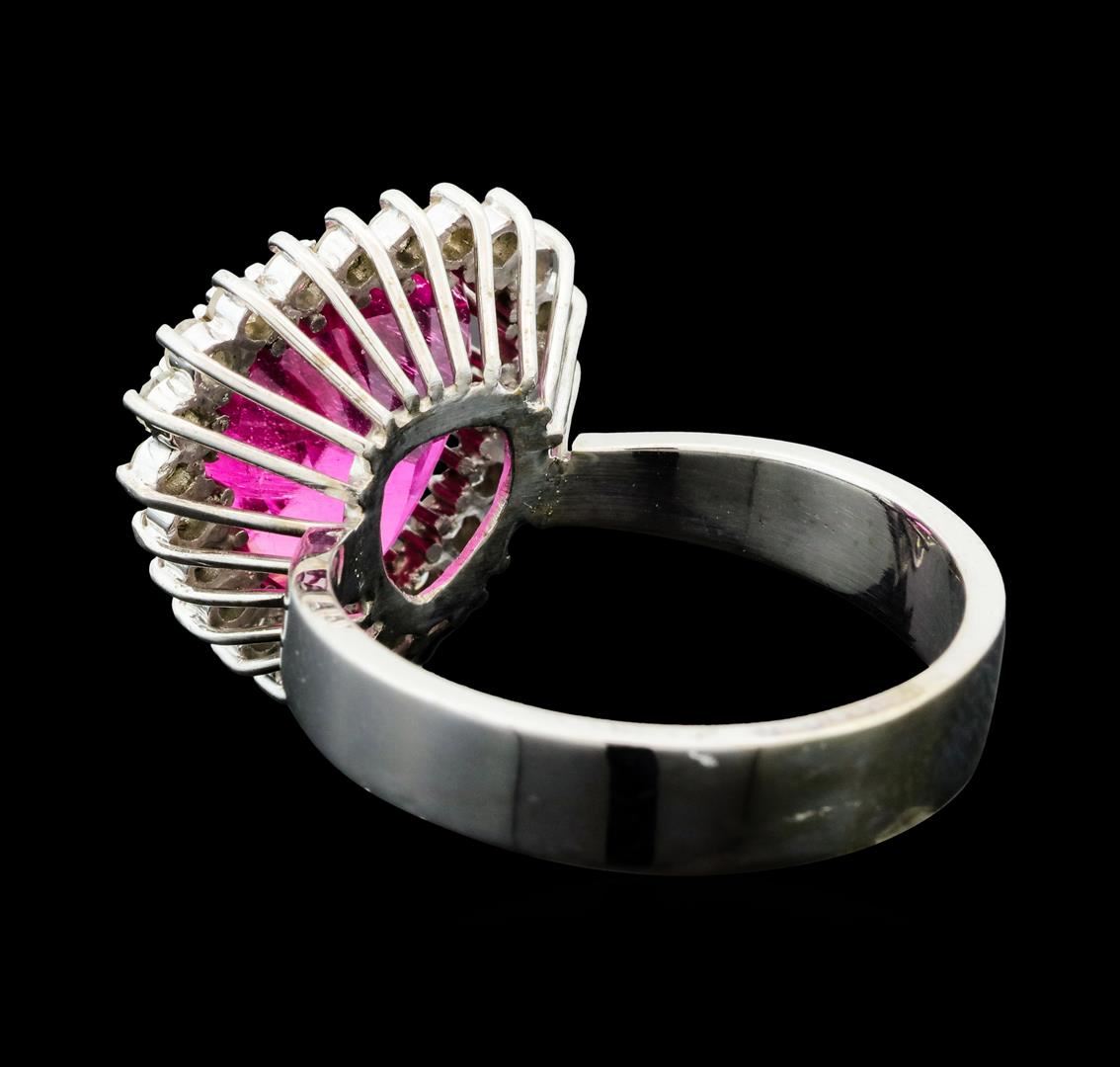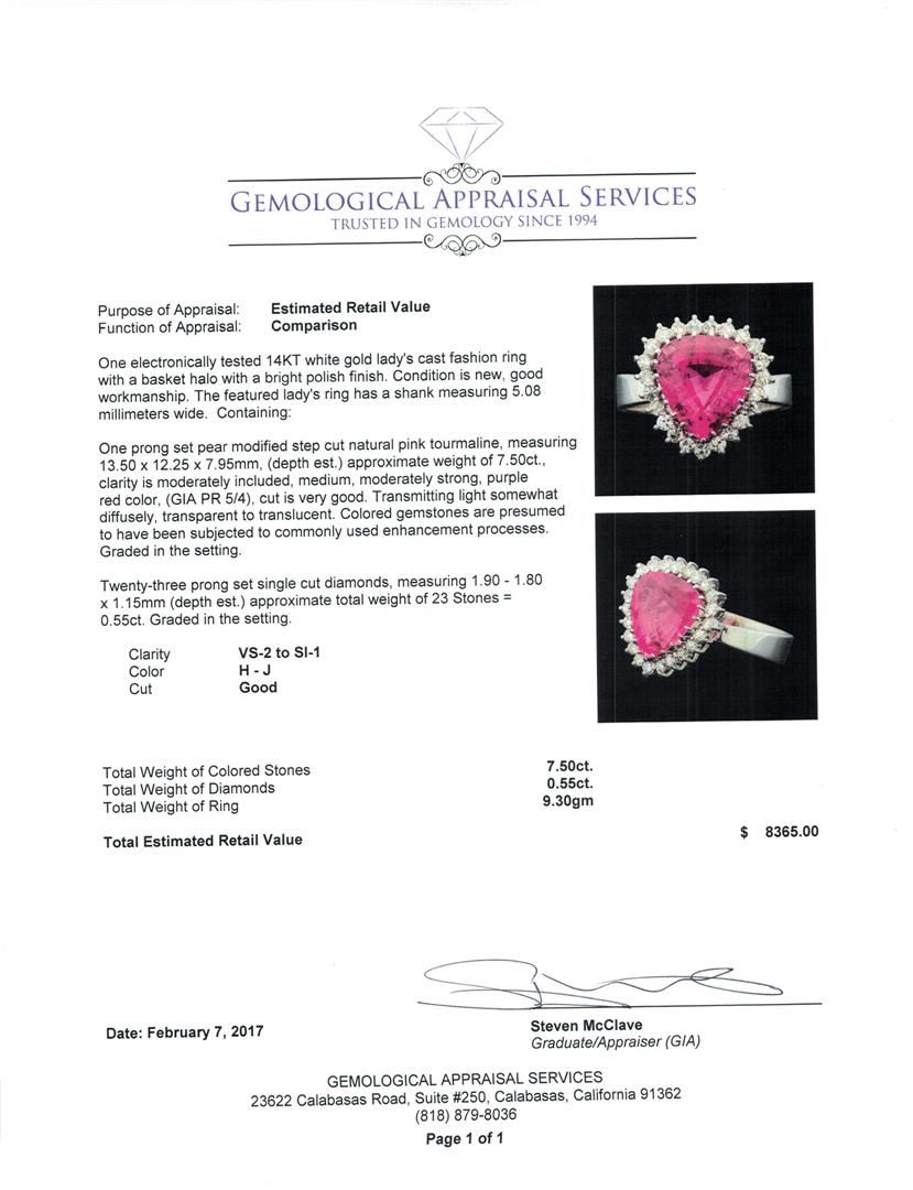 One electronically tested 14KT white gold lady's cast fashion ring with a basket halo with a bright polish finish. The featured lady's ring has a shank measuring 5.08 millimeters wide. Condition is new, good workmanship. Containing: One prong set pear modified step cut natural pink tourmaline, measuring 13.50 x 12.25 x 7.95mm, (depth est.) approximate weight of 7.50ct., clarity is moderately included, medium, moderately strong, purple red color, (GIA PR 5/4), cut is very good. Transmitting light somewhat diffusely, transparent to translucent. Colored gemstones are presumed to have been subjected to commonly used enhancement processes. Graded in the setting. Twenty-Three prong set single cut diamonds, measuring 1.90 - 1.80 x 1.15mm (depth est.) approximate total weight of 23 Stones = 0.55ct. Graded in the setting. Clarity VS-2 to SI-1. Color: H - J Cut Good. Total Weight of Colored Stones 7.50ct.. Total Weight of Diamonds 0.55ct.. Total Weight of Ring 9.30gm GAS Appraised at $8,365.00.