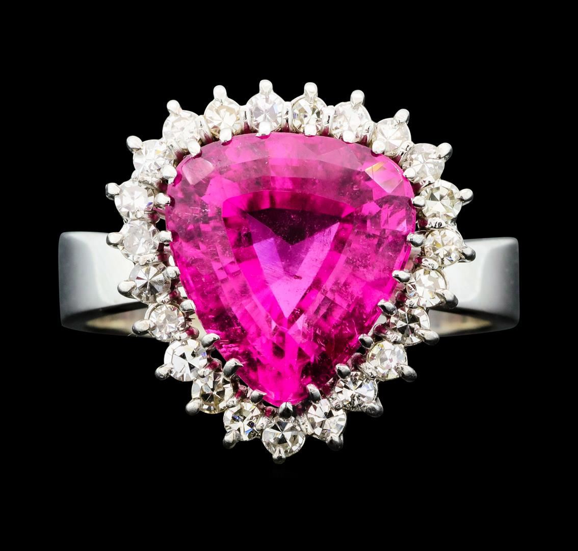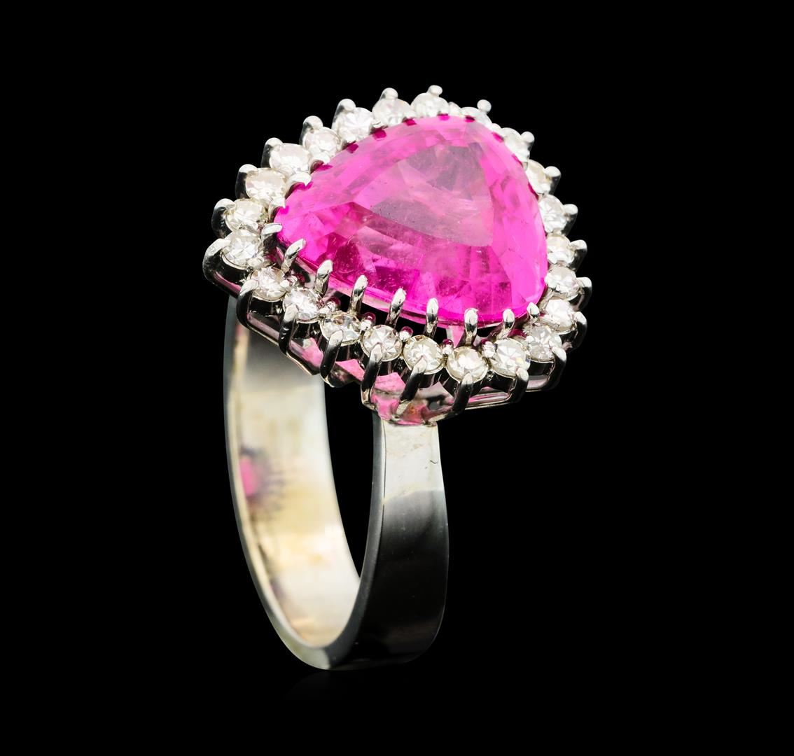 One electronically tested 14KT white gold lady's cast fashion ring with a basket halo with a bright polish finish. The featured lady's ring has a shank measuring 5.08 millimeters wide. Condition is new, good workmanship. Containing: One prong set pear modified step cut natural pink tourmaline, measuring 13.50 x 12.25 x 7.95mm, (depth est.) approximate weight of 7.50ct., clarity is moderately included, medium, moderately strong, purple red color, (GIA PR 5/4), cut is very good. Transmitting light somewhat diffusely, transparent to translucent. Colored gemstones are presumed to have been subjected to commonly used enhancement processes. Graded in the setting. Twenty-Three prong set single cut diamonds, measuring 1.90 - 1.80 x 1.15mm (depth est.) approximate total weight of 23 Stones = 0.55ct. Graded in the setting. Clarity VS-2 to SI-1. Color: H - J Cut Good. Total Weight of Colored Stones 7.50ct.. Total Weight of Diamonds 0.55ct.. Total Weight of Ring 9.30gm GAS Appraised at $8,365.00.
