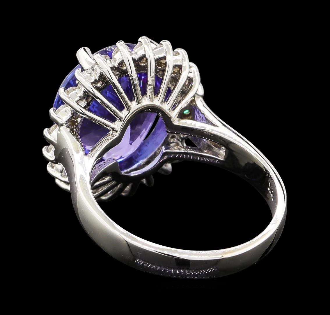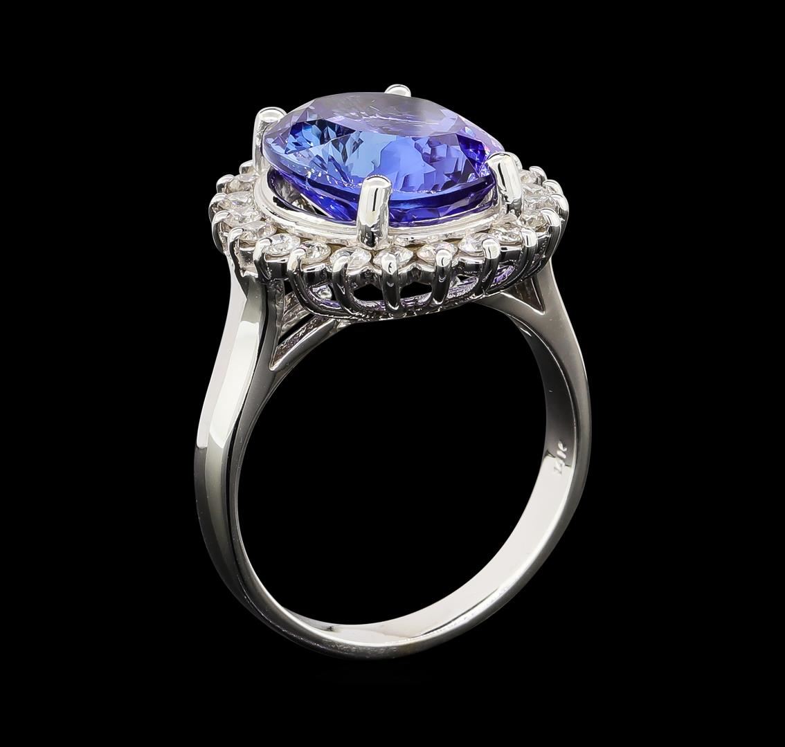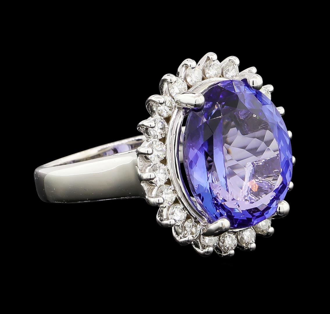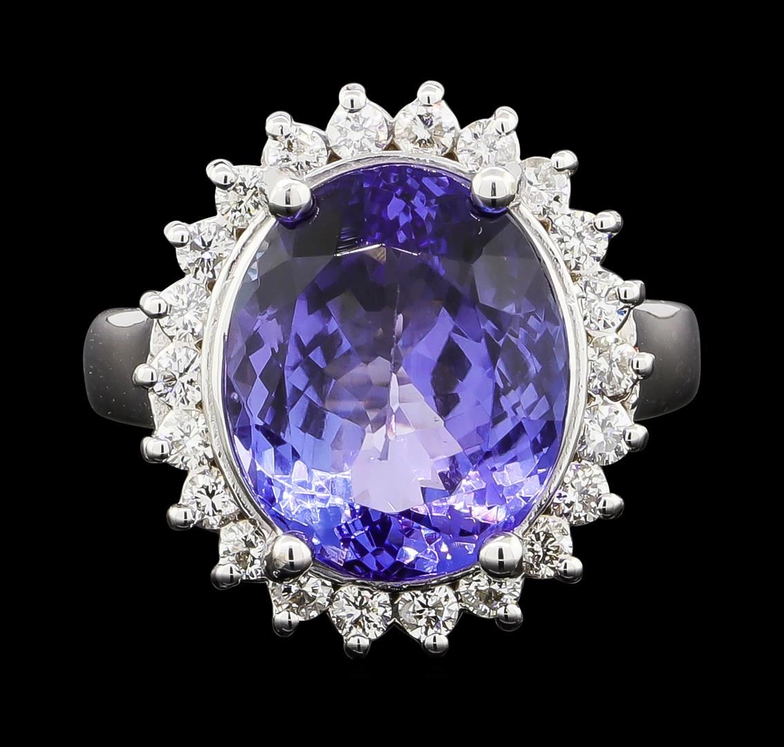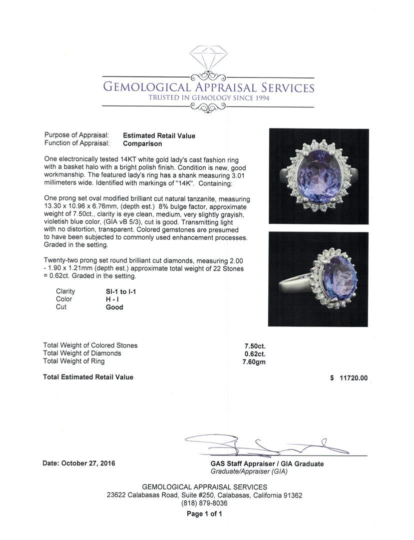 One electronically tested 14KT white gold lady's cast fashion ring with a basket halo with a bright polish finish. The featured lady's ring has a shank measuring 3.01 millimeters wide. Identified with markings of '14K'. Condition is new, good workmanship. Containing: One prong set oval modified brilliant cut natural tanzanite, measuring 13.30 x 10.96 x 6.76mm, (depth est.) 8%. bulge factor, approximate weight of 7.50ct., clarity is eye clean, medium, very slightly grayish, violetish blue color, (GIA vB 5/3), cut is good. Transmitting light with no distortion, transparent. Colored gemstones are presumed to have been subjected to commonly used enhancement processes. Graded in the setting. Twenty-Two prong set round brilliant cut diamonds, measuring 2.00 - 1.90 x 1.21mm (depth est.) approximate total weight of 22 Stones = 0.62ct. Graded in the setting. Clarity SI-1 to I-1. Color: H - I Cut Good. Total Weight of Colored Stones 7.50ct.. Total Weight of Diamonds 0.62ct.. Total Weight of Ring 7.60gm. GAS Appraised at $11,720.00.