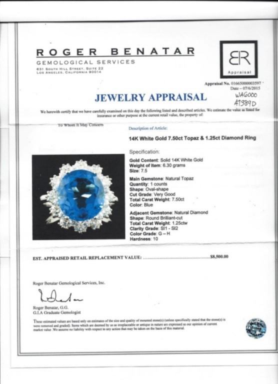 Estimated Retail Replacement Value: $8,500.00Ref: WAG6000Item no.: ARA7062Specification:Gold Content: Solid 14K White GoldWeight of Item: 6.30 gramsSize: 7.5Country Made: U.S.AMain Gemstone: Natural TopazShape: Oval cutQuantity: 1 countCarat Weight: 7.50ctClarity: Type 2Color Grade: BlueCut Grade: Very GoodAdjacent Gemstone: Natural DiamondShape: Round Brilliant-cutCarat Weight: 1.25ctwClarity Grade: SI1 - SI2Color Grade: G - HHardness: 10 Great Condition - Shipping notes: We ship 4-10 Business day after the clearance of payment. Tracking numbers are emailed once the package(s) are shipped. Most shipments are sent by FEDEX Priority, UPS Priority, or US PRIORITY MAIL INSURED