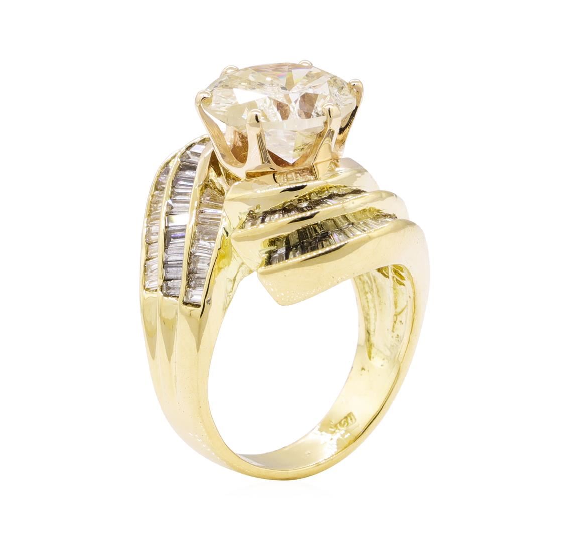 One electronically tested 18KT yellow gold lady's combination cast & assembled fashion ring with a bypass swirl with a bright polish finish. The featured lady's ring has a shank measuring 4.00 millimeters wide. Identified with markings of '18K'. Condition is like new, good workmanship. Containing: One prong set round brilliant cut diamond, measuring 11.11 - 11.05 x 6.37mm (depth est.) , 5.00.%. GTCF approximate weight of 5.01ct. Graded in the setting. Color L - M Clarity I-1 Cut Good Ninety channel set baguette cut (tapered) diamonds, measuring from 1.80 x 1.00 x 0.85mm (depth est.) to 2.70 x 1.50 x 1.28mm (depth est.) approximate total weight of 90 Stones = 2.50ct. Graded in the setting. Color J - L Clarity VS-2 to SI-1 Cut Very Good. Total Weight of Diamonds 7.51ct.. Total Weight of Ring 15.80gm GAS Appraised at $40990.00. GAS Appraised.