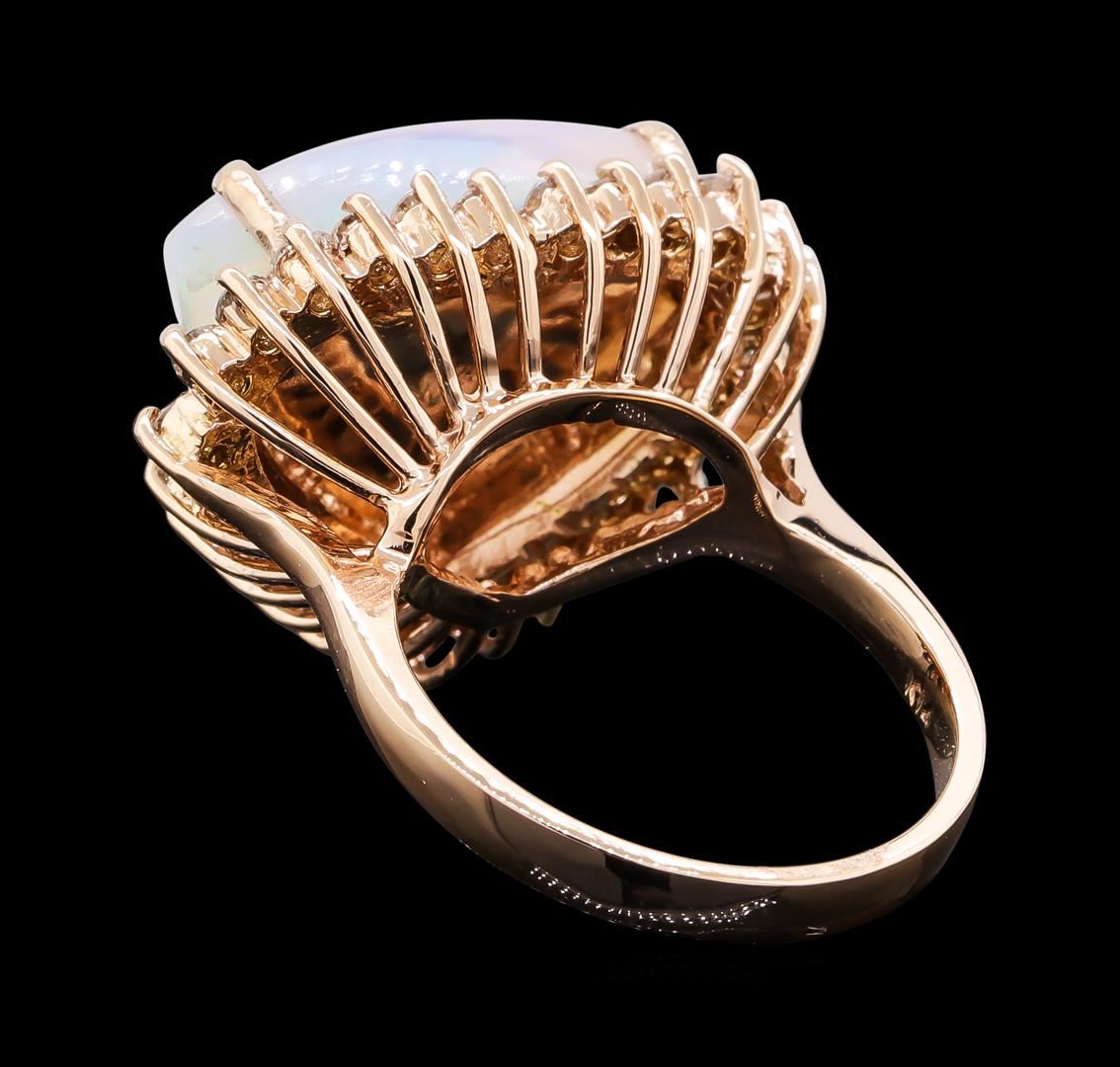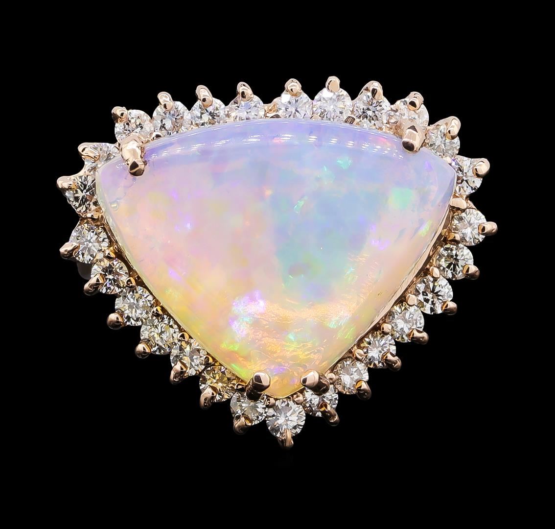 One electronically tested 14KT rose gold lady's cast fashion ring with a basket halo with a bright polish finish. The featured lady's ring has a shank measuring 2.67 millimeters wide. Identified with markings of 'K14'. Condition is new, good workmanship. Containing: One crystal opal that is cut in a triangle shaped cabochon and is prong set, measuring 15.21 mm long x 18.73 mm wide, and 5.50 mm thick and the approximate weight is 7.51 carats. The opal has a somewhat bright, multicolor play of color (fire) in a rolling flashfire pattern; a medium dome; a good cut; no inclusions; consistent in its brightness and pattern; and is not directional. Graded in the setting. Twenty-Seven prong set round brilliant cut diamonds, measuring 2.10 - 2.00 x 1.25mm (depth est.) approximate total weight of 27 Stones = 0.86ct. Graded in the setting. Clarity SI-1 to SI-2. Color: H - I Cut Good. Total Weight of Diamonds 0.86ct.. Total Weight of Opals 7.51ct.. Total Weight of Ring 9.80gm. GAS Appraised at $4,695.00.