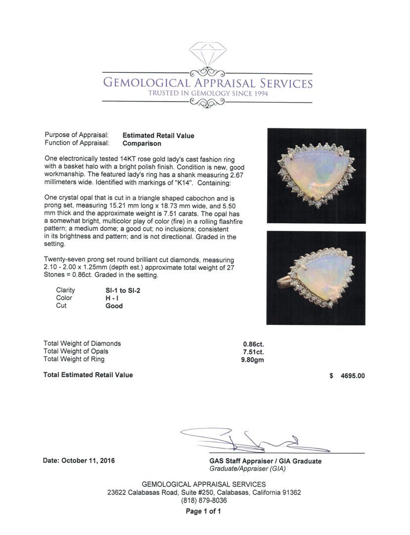One electronically tested 14KT rose gold lady's cast fashion ring with a basket halo with a bright polish finish. The featured lady's ring has a shank measuring 2.67 millimeters wide. Identified with markings of 'K14'. Condition is new, good workmanship. Containing: One crystal opal that is cut in a triangle shaped cabochon and is prong set, measuring 15.21 mm long x 18.73 mm wide, and 5.50 mm thick and the approximate weight is 7.51 carats. The opal has a somewhat bright, multicolor play of color (fire) in a rolling flashfire pattern; a medium dome; a good cut; no inclusions; consistent in its brightness and pattern; and is not directional. Graded in the setting. Twenty-Seven prong set round brilliant cut diamonds, measuring 2.10 - 2.00 x 1.25mm (depth est.) approximate total weight of 27 Stones = 0.86ct. Graded in the setting. Clarity SI-1 to SI-2. Color: H - I Cut Good. Total Weight of Diamonds 0.86ct.. Total Weight of Opals 7.51ct.. Total Weight of Ring 9.80gm. GAS Appraised at $4,695.00.