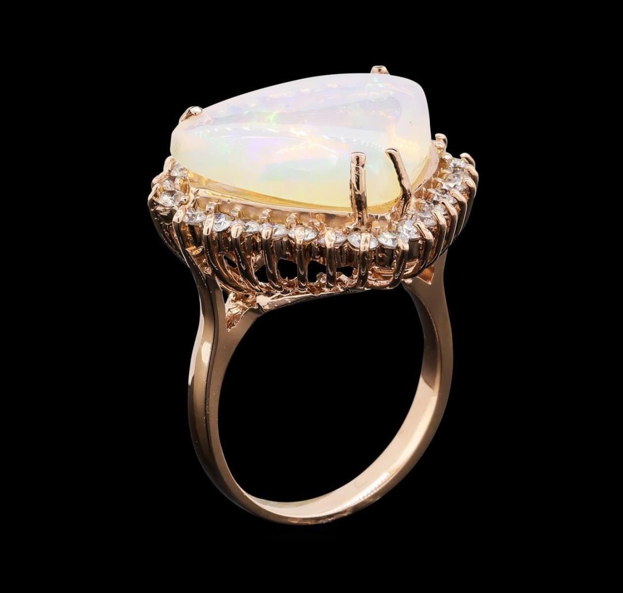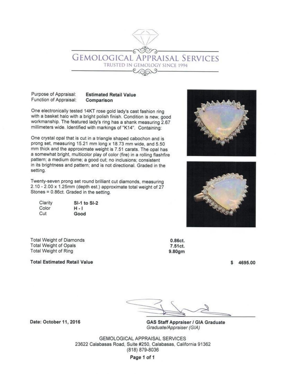 One electronically tested 14KT rose gold lady's cast fashion ring with a basket halo with a bright polish finish. The featured lady's ring has a shank measuring 2.67 millimeters wide. Identified with markings of 'K14'. Condition is new, good workmanship. Containing: One crystal opal that is cut in a triangle shaped cabochon and is prong set, measuring 15.21 mm long x 18.73 mm wide, and 5.50 mm thick and the approximate weight is 7.51 carats. The opal has a somewhat bright, multicolor play of color (fire) in a rolling flashfire pattern; a medium dome; a good cut; no inclusions; consistent in its brightness and pattern; and is not directional. Graded in the setting. Twenty-Seven prong set round brilliant cut diamonds, measuring 2.10 - 2.00 x 1.25mm (depth est.) approximate total weight of 27 Stones = 0.86ct. Graded in the setting. Clarity SI-1 to SI-2. Color: H - I Cut Good. Total Weight of Diamonds 0.86ct.. Total Weight of Opals 7.51ct.. Total Weight of Ring 9.80gm. GAS Appraised.