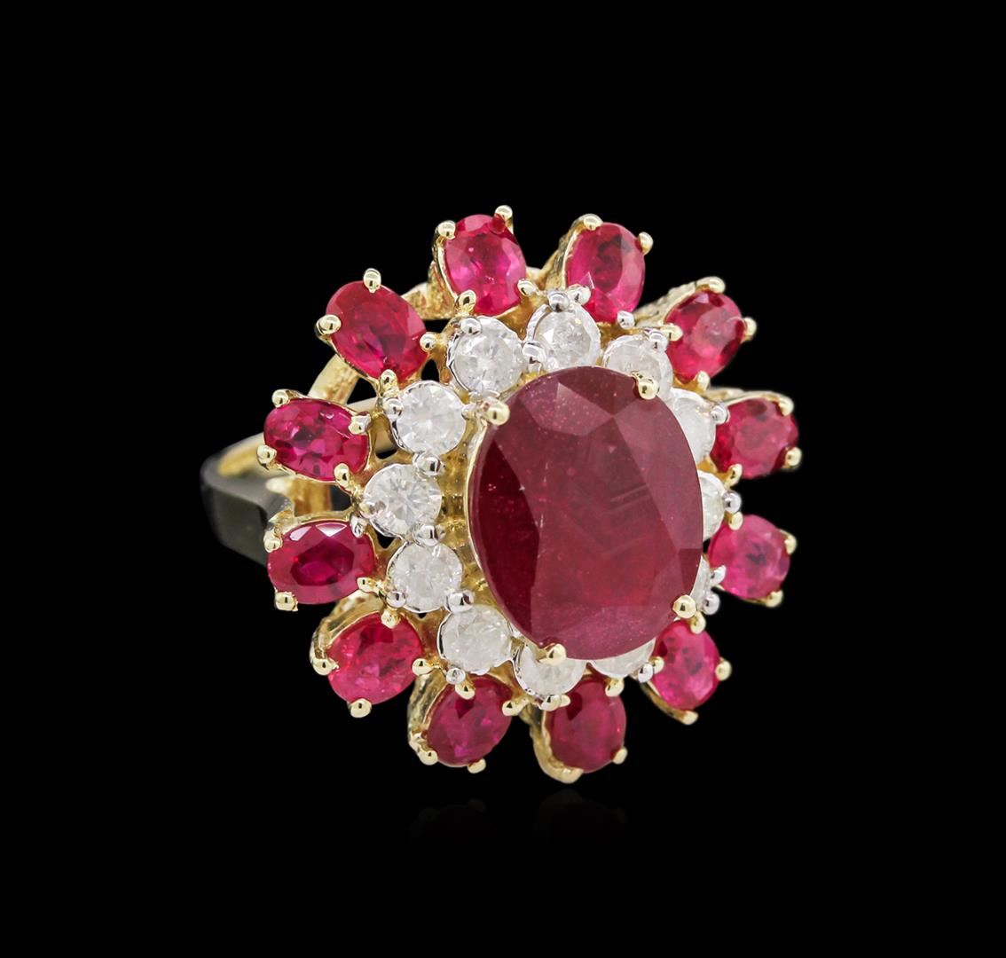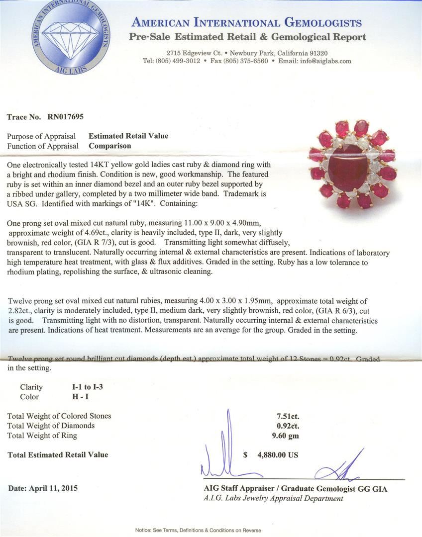 One electronically tested 14KT yellow gold ladies cast ruby & diamond ring with a bright and rhodium finish. The featured ruby is set within an inner diamond bezel and an outer ruby bezel supported by a ribbed under gallery, completed by a two millimeter wide band. Trademark is USA SG. Identified with markings of "14K". Condition is new, good workmanship. Containing: One prong set oval mixed cut natural ruby, measuring 11.00 x 9.00 x 4.90mm, approximate weight of 4.69ct., clarity is heavily included, type II, dark, very slightly brownish, red color, (GIA R 7/3), cut is good. Transmitting light somewhat diffusely, transparent to translucent. Naturally occurring internal & external characteristics are present. Indications of laboratory high temperature heat treatment, with glass & flux additives. Graded in the setting. Ruby has a low tolerance to rhodium plating, repolishing the surface, & ultrasonic cleaning. Twelve prong set oval mixed cut natural rubies, measuring 4.00 x 3.00 x 1.95mm, approximate total weight of 2.82ct., clarity is moderately included, type II, medium dark, very slightly brownish, red color, (GIA R 6/3), cut is good. Transmitting light with no distortion, transparent. Naturally occurring internal & external characteristics are present. Indications of heat treatment. Measurements are an average for the group. Graded in the setting. Twelve prong set round brilliant cut diamonds (depth est.) approximate total weight of 12 Stones = 0.92ct. Graded in the setting. Clarity: I-1 to I-3. Color: H - I. Total Weight of Colored Stones 7.51ct. Total Weight of Diamonds 0.92ct. AIG Appraised at $4,880.00.