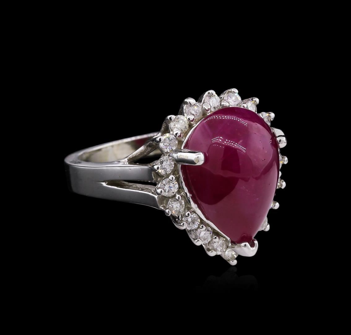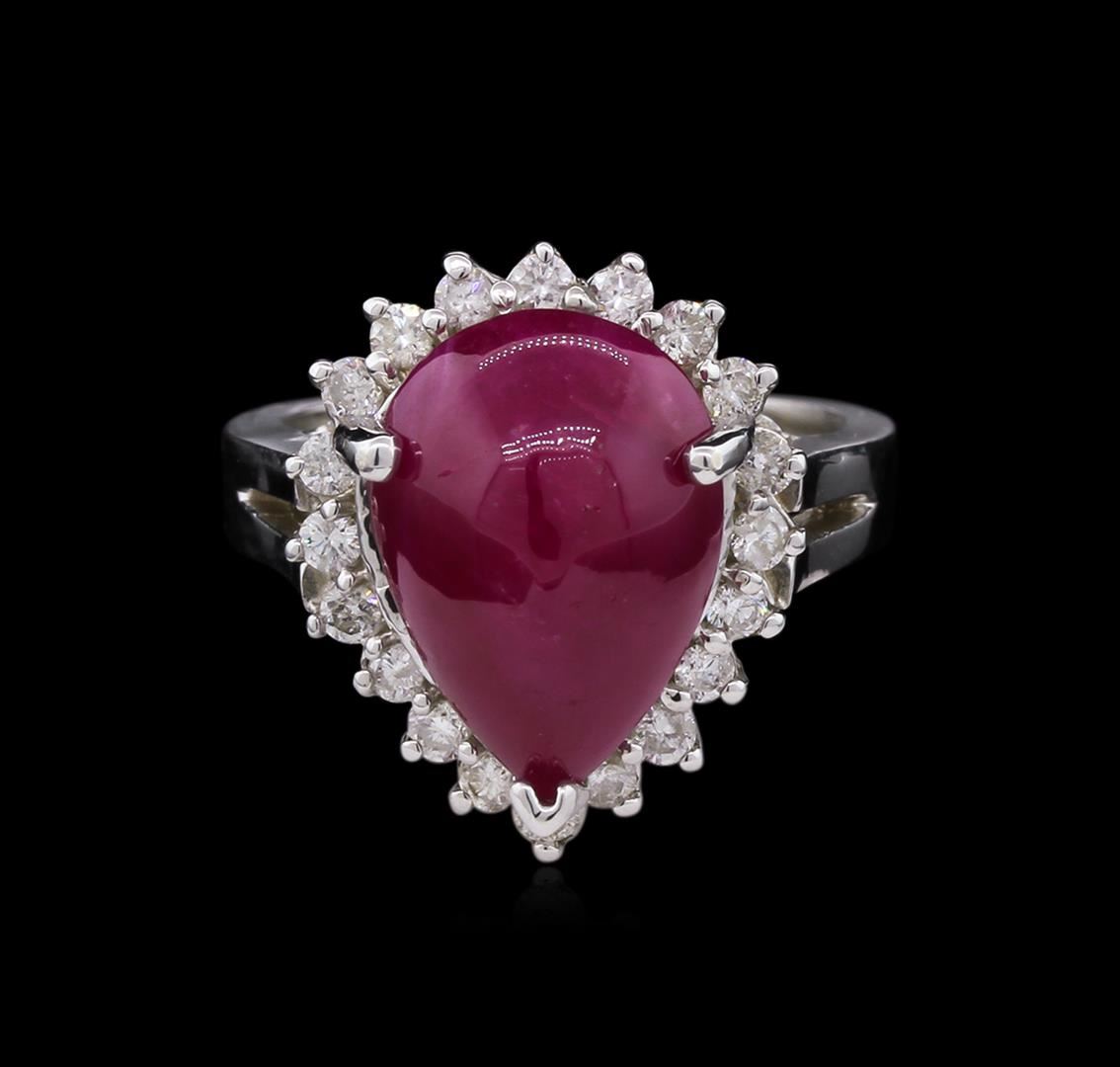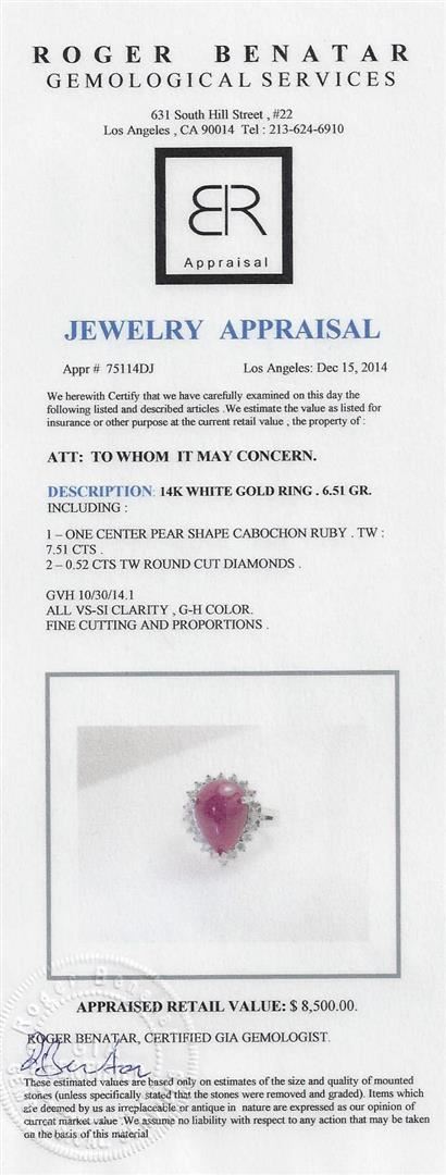 One 14KT White gold ring. 6.51 GR. Including: One center pear shape cabochon ruby. Tw 7.51 CTS. 0.52 CTS TW round cut diamonds. All VS-SI Clarity, G-H Color Fine Cutting and Proportions. RBGS Appraised at $8,500.00.