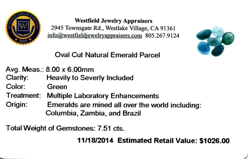 7.51cts. Oval Cut Natural Emerald Parcel Westfield Appraised at $1,026.00.