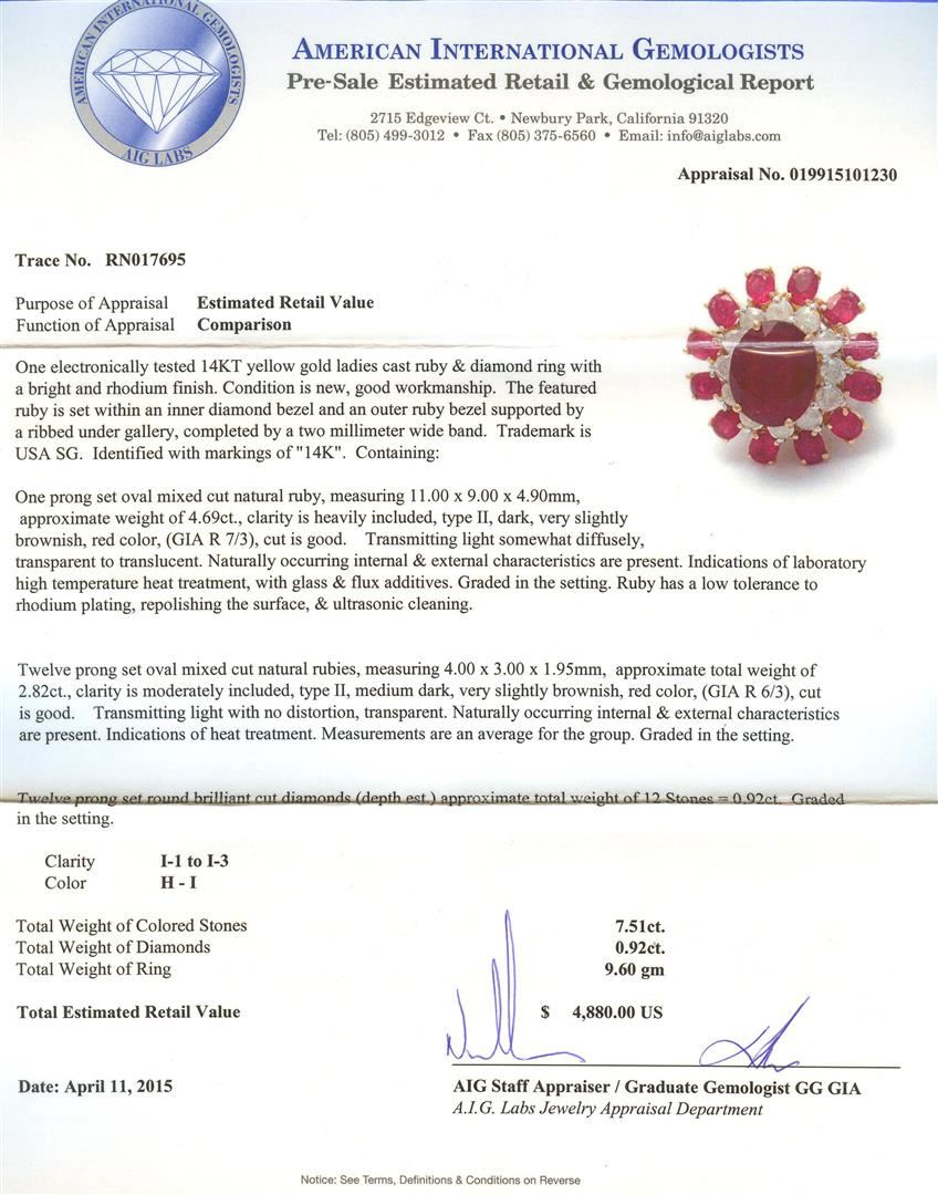 One electronically tested 14KT yellow gold ladies cast ruby & diamond ring with a bright and rhodium finish. The featured ruby is set within an inner diamond bezel and an outer ruby bezel supported by a ribbed under gallery, completed by a two millimeter wide band. Trademark is USA SG. Identified with markings of "14K". Condition is new, good workmanship. Containing: One prong set oval mixed cut natural ruby, measuring 11.00 x 9.00 x 4.90mm, approximate weight of 4.69ct., clarity is heavily included, type II, dark, very slightly brownish, red color, (GIA R 7/3), cut is good. Transmitting light somewhat diffusely, transparent to translucent. Naturally occurring internal & external characteristics are present. Indications of laboratory high temperature heat treatment, with glass & flux additives. Graded in the setting. Ruby has a low tolerance to rhodium plating, repolishing the surface, & ultrasonic cleaning. Twelve prong set oval mixed cut natural rubies, measuring 4.00 x 3.00 x 1.95mm, approximate total weight of 2.82ct., clarity is moderately included, type II, medium dark, very slightly brownish, red color, (GIA R 6/3), cut is good. Transmitting light with no distortion, transparent. Naturally occurring internal & external characteristics are present. Indications of heat treatment. Measurements are an average for the group. Graded in the setting. Twelve prong set round brilliant cut diamonds (depth est.) approximate total weight of 12 Stones = 0.92ct. Graded in the setting. Clarity: I-1 to I-3. Color: H - I. Total Weight of Colored Stones 7.51ct. Total Weight of Diamonds 0.92ct. AIG Appraised at $4,880.00.