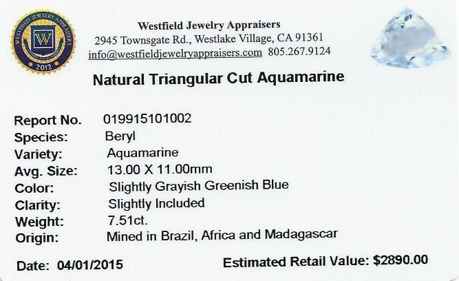 One triangle cut natural aquamarine exact weight 7.51ct., clarity is slightly included, type I, medium light, slightly grayish, very slightly greenish blue color, (GIA vslgB 4/2), cut is good. Westfield Appraised at $2,890.00.