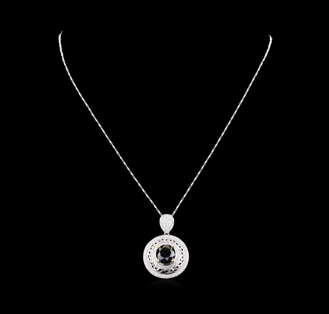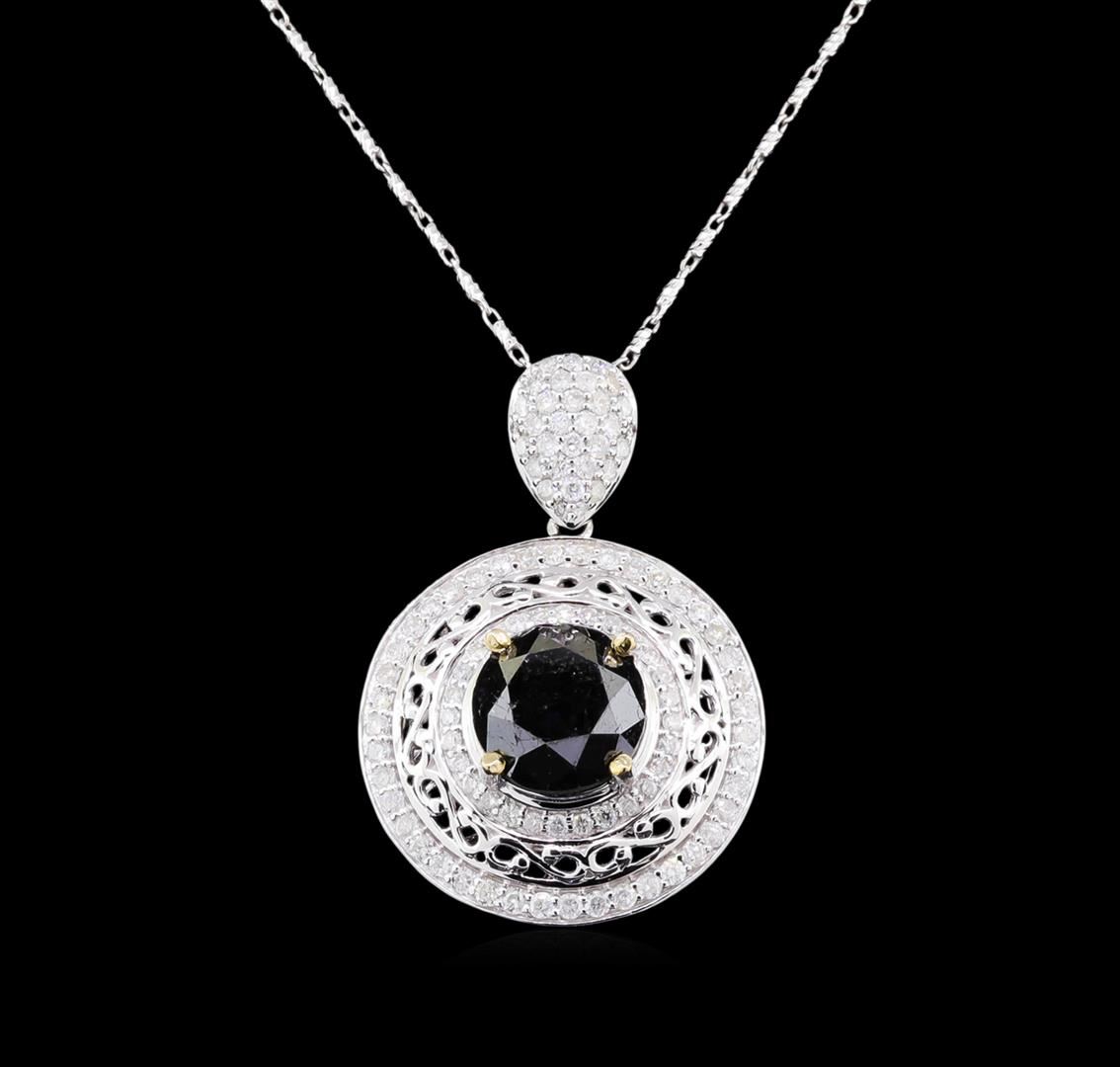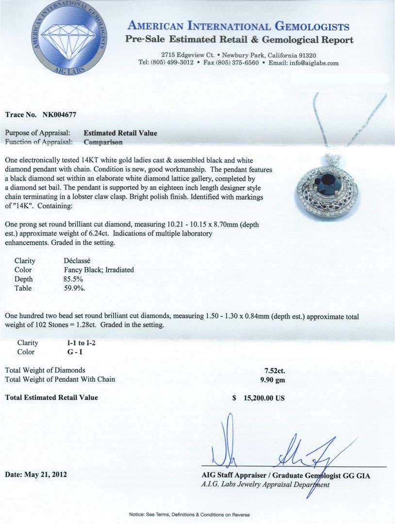 One electronically tested 14KT white gold ladies cast & assembled black and white diamond pendant with chain. The pendant features a black diamond set within an elaborate white diamond lattice gallery, completed by a diamond set bail. The pendant is supported by an eighteen inch length designer style chain terminating in a lobster claw clasp. Bright polish finish. Identified with markings of "14K". Condition is new, good workmanship. Containing: One prong set round brilliant cut diamond, measuring 10.21 - 10.15 x 8.70mm (depth est.) approximate weight of 6.24ct. Indications of multiple laboratory enhancements. Graded in the setting. Clarity Déclassé‚. Color: Fancy Black; Irradiated. Depth: 85.5%. Table: 59.9%. One Hundred Two bead set round brilliant cut diamonds, measuring 1.50 - 1.30 x 0.84mm (depth est.) approximate total weight of 102 Stones = 1.28ct. Graded in the setting. Clarity: I-1 to I-2. Color: G - I. Total Weight of Diamonds 7.52ct. Total Weight of Pendant With Chain 9.90gm. AIG Appraised at $15,200.00.