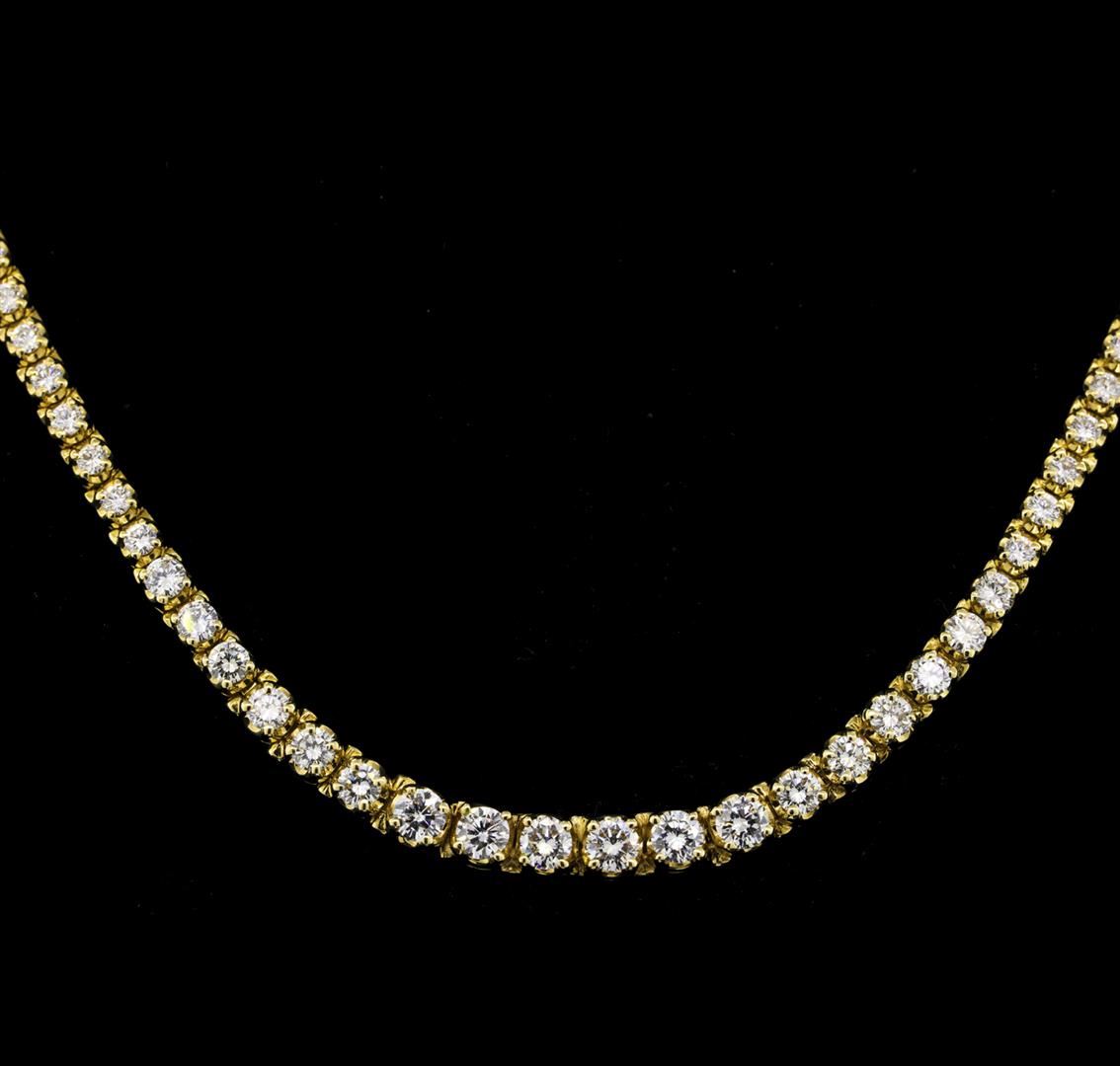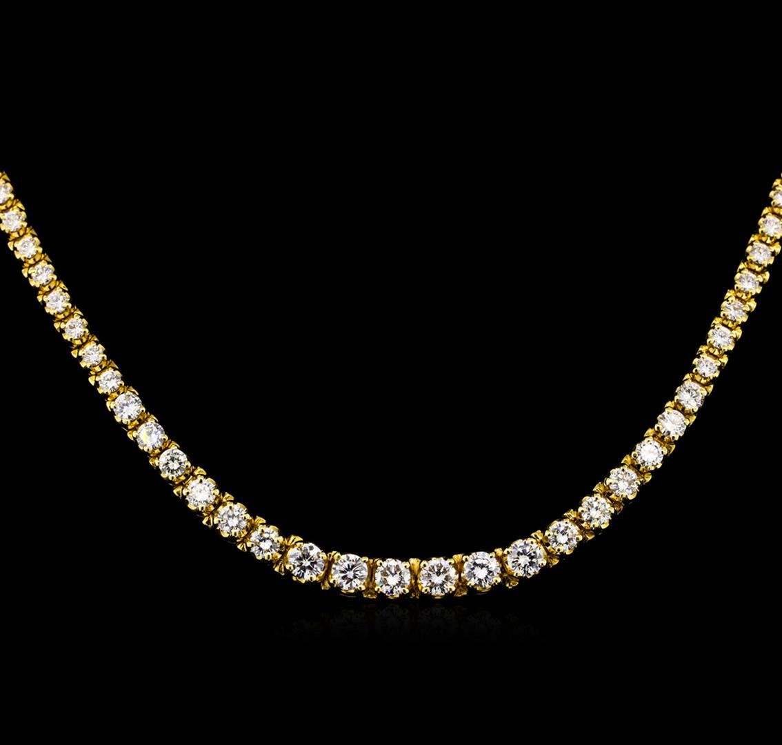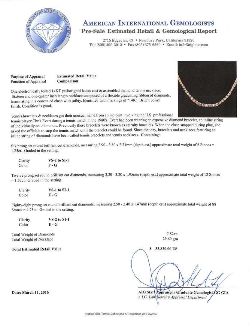 One electronically tested 14KT yellow gold ladies cast & assembled diamond tennis necklace. Sixteen and one-quarter inch length necklace composed of a flexible graduating ribbon of diamonds, terminating in a concealed clasp with safety. Identified with markings of "14K". Bright polish finish. Condition is good. Tennis bracelets & necklaces got their unusual name from an incident involving the U.S. professional tennis player Chris Evert during a tennis match in the 1980's. Evert had been wearing an expensive diamond bracelet, an inline string of individually-set diamonds. Previously these bracelets were known as eternity bracelets. When the clasp snapped during play, she asked the officials to stop the tennis match until the bracelet could be found. Since that day, bracelets and necklaces featuring an inline string of diamonds have been called tennis bracelets and tennis necklaces. Containing: Six prong set round brilliant cut diamonds, measuring 3.90 - 3.80 x 2.31mm (depth est.) approximate total weight of 6 Stones = 1.25ct. Graded in the setting. Clarity: VS-2 to SI-1. Color: F - G Twelve prong set round brilliant cut diamonds, measuring 3.30 - 3.20 x 1.95mm (depth est.) approximate total weight of 12 Stones = 1.52ct. Graded in the setting. Clarity: VS-1 to SI-1. Color: E - G Eighty-Eight prong set round brilliant cut diamonds, measuring 2.50 - 2.40 x 1.47mm (depth est.) approximate total weight of 88 Stones = 4.75ct. Graded in the setting. Clarity: VS-2 to SI-1. Color: E - G. Total Weight of Diamonds 7.52ct. Total Weight of Necklace 29.69gm. AIG Appraised at $33,820.00.