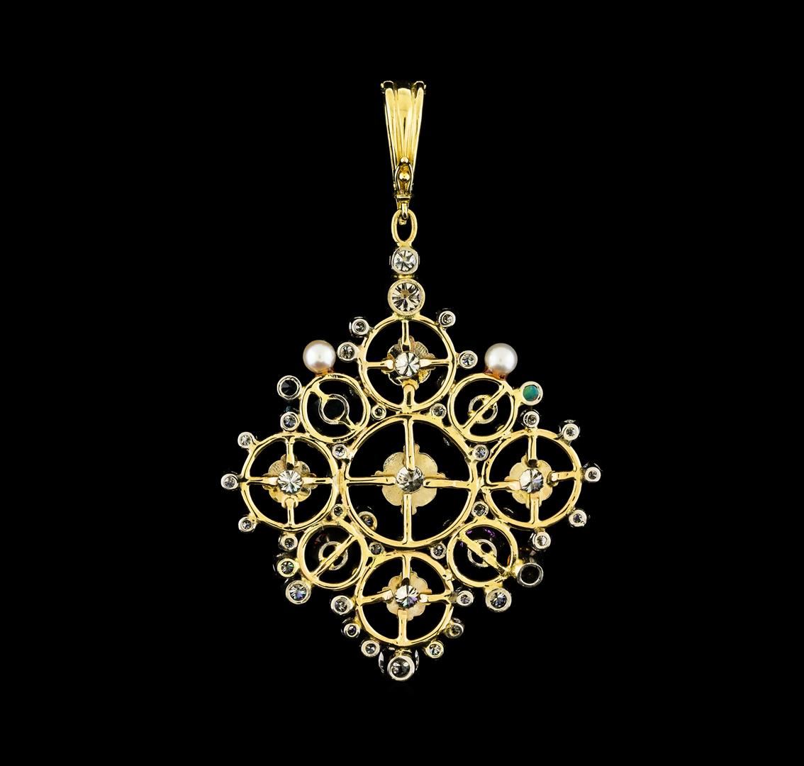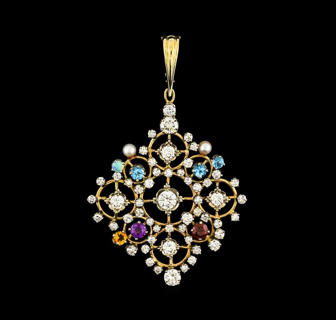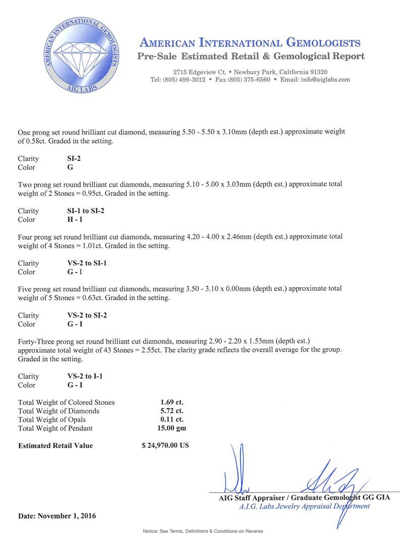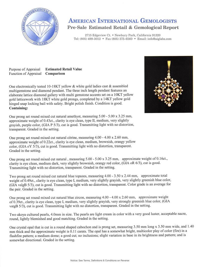One electronically tested 10-18KT yellow & white gold ladies cast & assembled multi gemstone and diamond pendant. The three inch length pendant features an elaborate lattice diamond gallery with multi gemstone accents set on a 10KT yellow gold latticework with 18KT white gold prongs, completed by a 14KT yellow gold hinged snap locking bail with safety. Bright polish finish. Condition is good. Containing: One prong set round mixed cut natural amethyst, measuring 5.00 - 5.00 x 3.25 mm, approximate weight of 0.43ct., clarity is eye clean, type II, medium, very slightly grayish, purple color, (GIA P 5/3), cut is good. Transmitting light with no distortion, transparent. Graded in the setting. One prong set round mixed cut natural citrine, measuring 4.00 - 4.00 x 2.60 mm, approximate weight of 0.22ct., clarity is eye clean, medium, brownish, orangy yellow color, (GIA oY 5/3), cut is good. Transmitting light with no distortion, transparent. Graded in the setting. One prong set round mixed cut natural , measuring 5.00 - 5.00 x 3.25 mm, approximate weight of 0.16ct., clarity is eye clean, medium dark, very slightly brownish, orangy red color, (GIA oR 6/3), cut is good. Transmitting light with no distortion, transparent. Graded in the setting. Two prong set round mixed cut natural blue topaz's, measuring 4.00 - 3.50 x 2.44 mm, approximate total weight of 0.49ct., clarity is eye clean, type I, medium, very slightly grayish, very slightly greenish blue color, (GIA vslgB 5/3), cut is good. Transmitting light with no distortion, transparent. Color grade is an average for the pair. Graded in the setting. One prong set round mixed cut natural blue zircon, measuring 4.00 - 4.00 x 2.60 mm, approximate weight of 0.39ct., clarity is eye clean, type I, medium, very slightly grayish, very strongly greenish blue color, (GIA vstgB 5/3), cut is good. Transmitting light with no distortion, transparent. Graded in the setting. Two akoya cultured pearls, 4.0mm in size. The pearls are light cream in color with a very good luster, acceptable nacre, round, lightly blemished Graded in the setting. One crystal opal that is cut in a round shaped cabochon and is prong set, measuring 3.50 mm long x 3.50 mm wide, and 1.40 mm thick and the approximate weight is 0.11 carats. The opal has a somewhat bright, multicolor play of color (fire) in a flashfire pattern; a medium dome; a good cut; no inclusions; slight variation in base in its brightness and pattern; and is somewhat directional. Graded in the setting. One prong set round brilliant cut diamond, measuring 5.50 - 5.50 x 3.10mm (depth est.) approximate weight of 0.58ct. Graded in the setting. Clarity SI-2. Color: G Two prong set round brilliant cut diamonds, measuring 5.10 - 5.00 x 3.03mm (depth est.) approximate total weight of 2 Stones = 0.95ct. Graded in the setting. Clarity SI-1 to SI-2. Color: H - I Four prong set round brilliant cut diamonds, measuring 4.20 - 4.00 x 2.46mm (depth est.) approximate total weight of 4 Stones = 1.01ct. Graded in the setting. Clarity VS-2 to SI-1. Color: G - I Five prong set round brilliant cut diamonds, measuring 3.50 - 3.10 x 0.00mm (depth est.) approximate total weight of 5 Stones = 0.63ct. Graded in the setting. Clarity VS-2 to SI-2. Color: G - I Forty-Three prong set round brilliant cut diamonds, measuring 2.90 - 2.20 x 1.53mm (depth est.) approximate total weight of 43 Stones = 2.55ct. The clarity grade reflects the overall average for the group. Graded in the setting. Clarity VS-2 to I-1. Color: G - I. Total Weight of Colored Stones 1.69ct.. Total Weight of Diamonds 5.72ct.. Total Weight of Opals 0.11ct.. Total Weight of Pendant 15.00gm. AIG Appraised at $24,970.00.