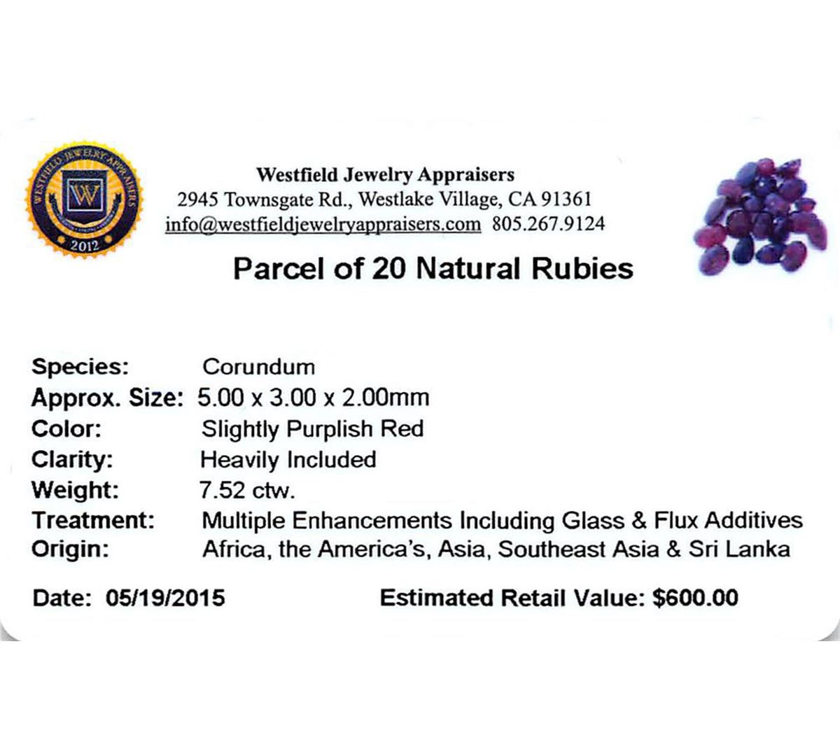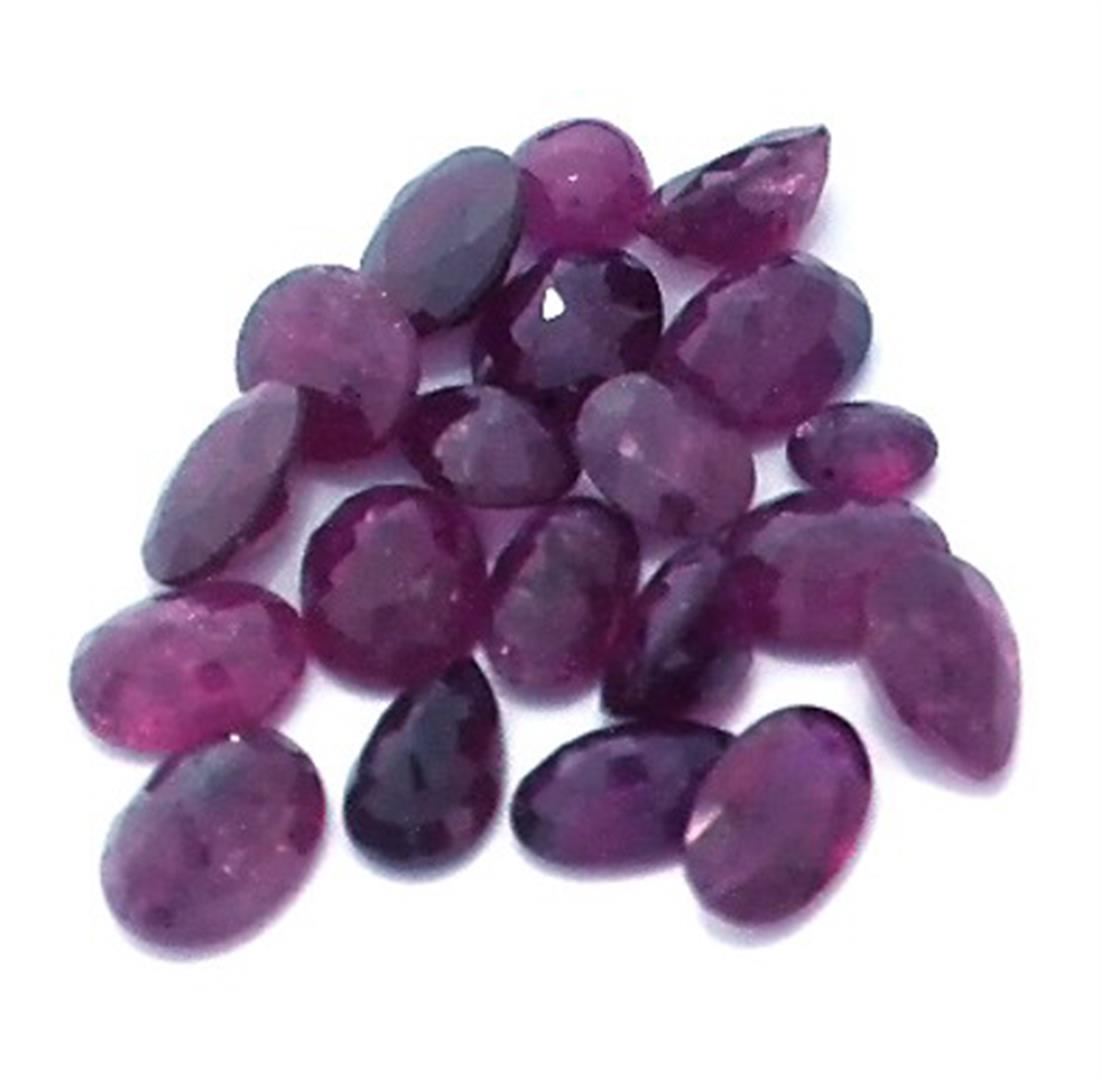 Twenty various shapes and sizes cut natural rubies, measuring 5.00 x 3.00 x 2.00mm, exact total weight 7.52ct., clarity is heavily included, type II, very dark, very slightly brownish, red color, (GIA R 8/3), cut is good. Measurements are an average for the group. Transmitting light somewhat diffusely, transparent to translucent. Naturally occurring internal & external characteristics are present. Indications of laboratory high temperature heat treatment, with glass & flux additives. Ruby has a low tolerance to rhodium plating, repolishing the surface, & ultrasonic cleaning. Westfield Appraised at $600.00.