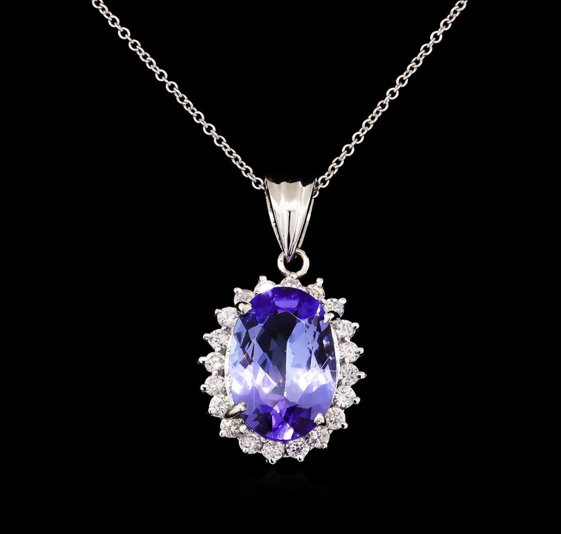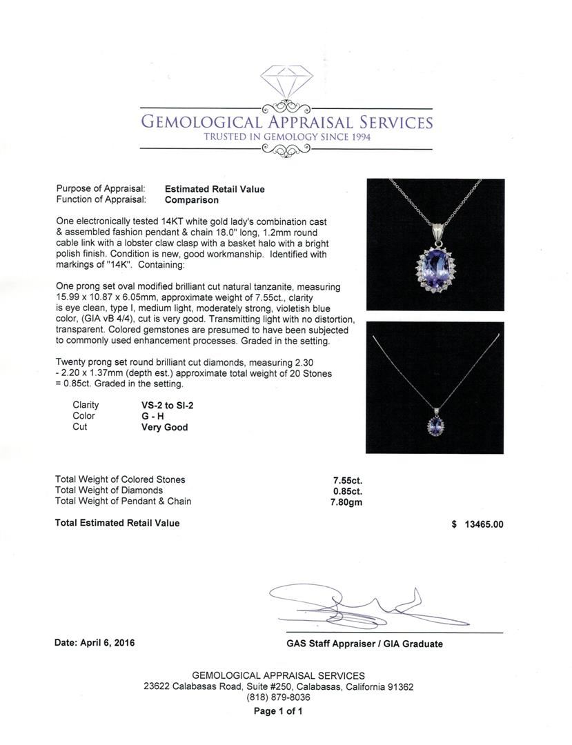 One electronically tested 14KT white gold lady's combination cast & assembled fashion pendant & chain 18.0" long, 1.2mm round cable link with a lobster claw clasp with a basket halo with a bright polish finish. Identified with markings of "14K". Condition is new, good workmanship. Containing: One prong set oval modified brilliant cut natural tanzanite, measuring 15.99 x 10.87 x 6.05mm, approximate weight of 7.55ct., clarity is eye clean, type I, medium light, moderately strong, violetish blue color, (GIA vB 4/4), cut is very good. Transmitting light with no distortion, transparent. Colored gemstones are presumed to have been subjected to commonly used enhancement processes. Graded in the setting. Twenty prong set round brilliant cut diamonds, measuring 2.30 - 2.20 x 1.37mm (depth est.) approximate total weight of 20 Stones = 0.85ct. Graded in the setting. Clarity: VS-2 to SI-2. Color: G - H. Cut Very Good. Total Weight of Colored Stones 7.55ct. Total Weight of Diamonds 0.85ct. Total Weight of Pendant & Chain 7.80gm. GAS Appraised at $13,465.00.