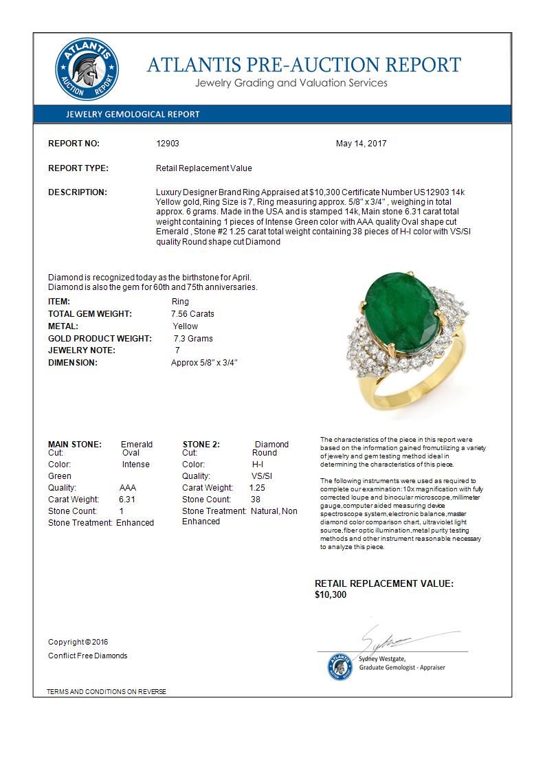 7.56 CTW Emerald & Diamond Ring 14K Yellow Gold ---- Luxury Designer Brand Ring Appraised Retail Price at $10,300 ---- SKU Number US12903 14k Yellow gold Ring Size is 7, Ring measuring approx. 5/8" x 3/4" , weighing in total approx. 6 grams. Made in the USA and is stamped 14k, Main stone 6.31 carat total weight containing 1 pieces of Intense Green color with AAA quality Oval shape cut Emerald , Stone #2 1.25 carat total weight containing 38 pieces of H-I color with VS/SI quality Round shape cut