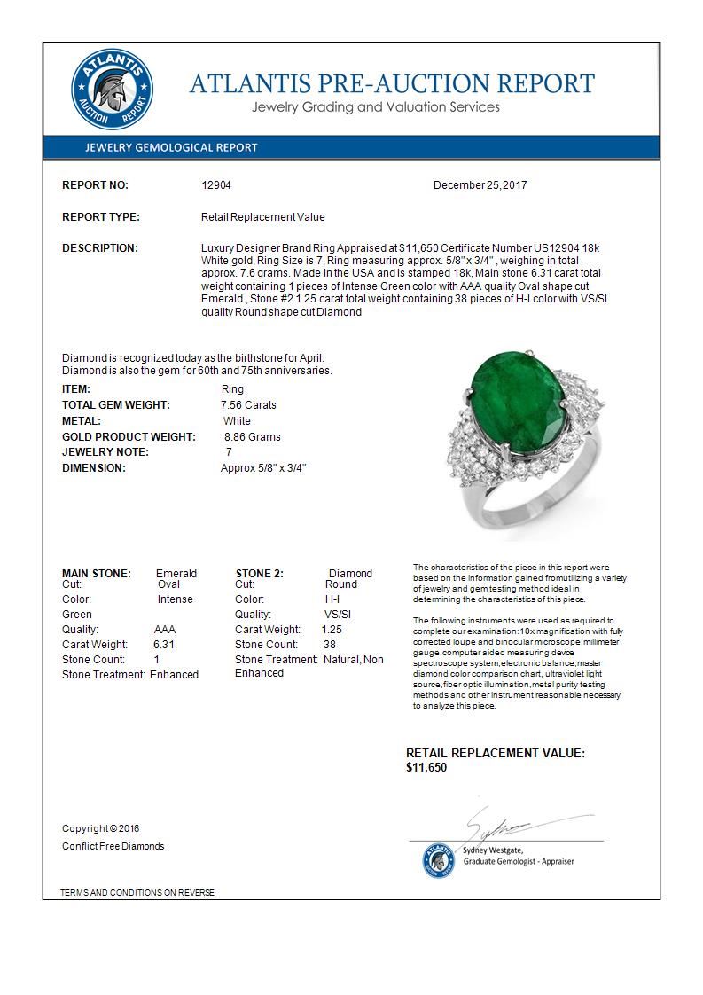 REF-162K9W -12904 ---- 7.56 CTW Emerald & Diamond Ring 18K White Gold ---- Luxury Designer Brand Ring Appraised at $11,650 Certificate Number US12904 18k White gold, Ring Size is 7, Ring measuring approx. 5/8" x 3/4" , weighing in total approx. 7.6 grams. Made in the USA and is stamped 18k, Main stone 6.31 carat total weight containing 1 pieces of Intense Green color with AAA quality Oval shape cut Emerald , Stone #2 1.25 carat total weight containing 38 pieces of H-I color with VS/SI quality Round shape cut Diamond