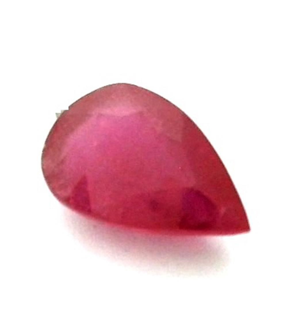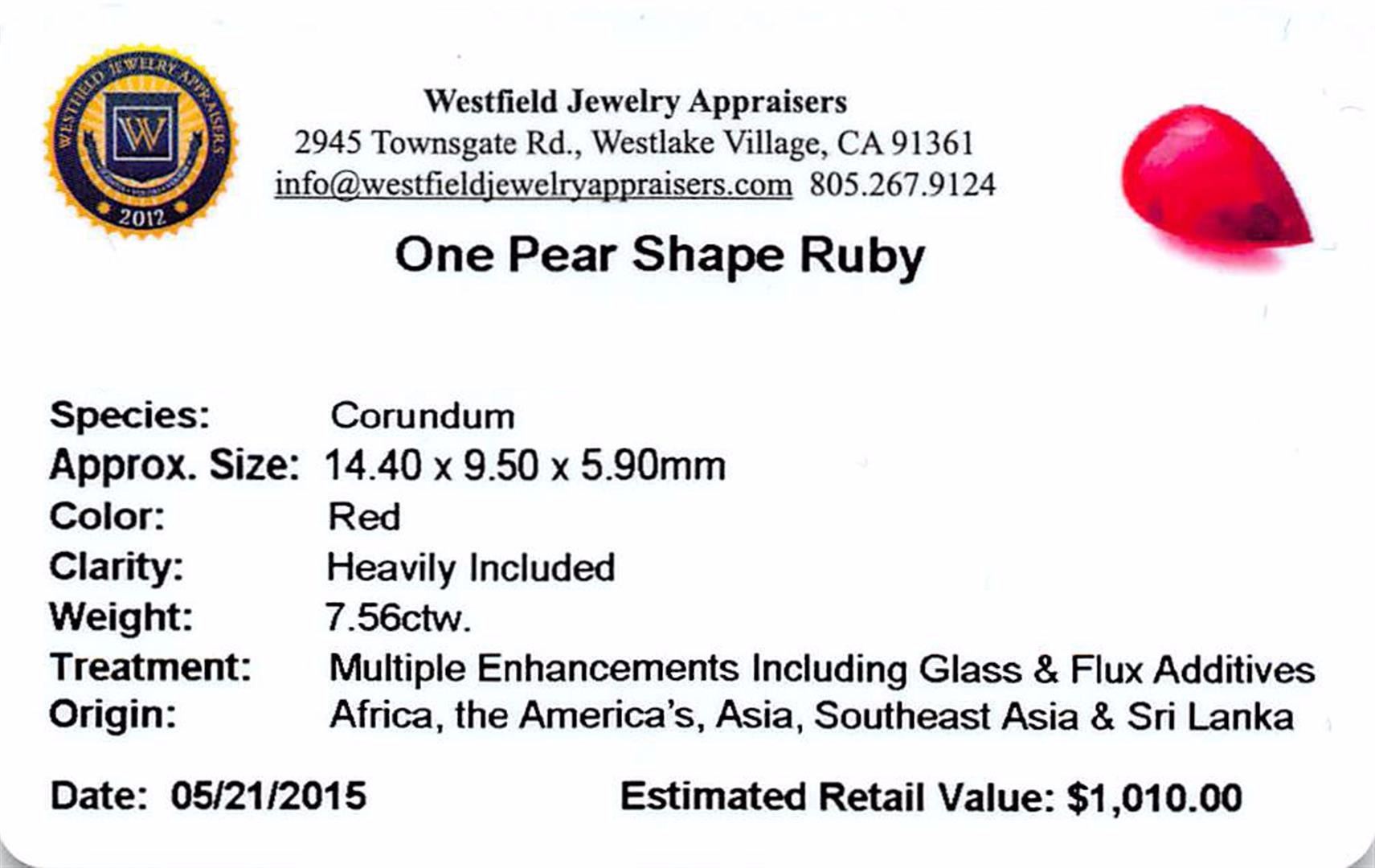 One pear mixed cut natural ruby, measuring 14.40 x 9.50 x 5.90mm, exact weight 7.56ct., clarity is heavily included, type II, dark, very slightly brownish, red color, (GIA R 7/3), cut is good. Transmitting light somewhat diffusely, transparent to translucent. Naturally occurring internal & external characteristics are present. Indications of laboratory high temperature heat treatment, with glass & flux additives. Ruby has a low tolerance to rhodium plating, repolishing the surface, & ultrasonic cleaning. Westfield Appraised at $1,010.00.