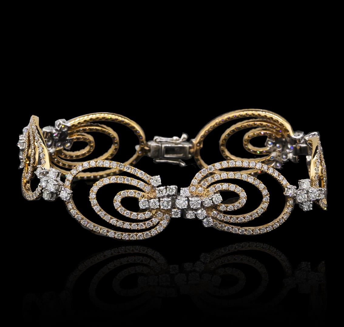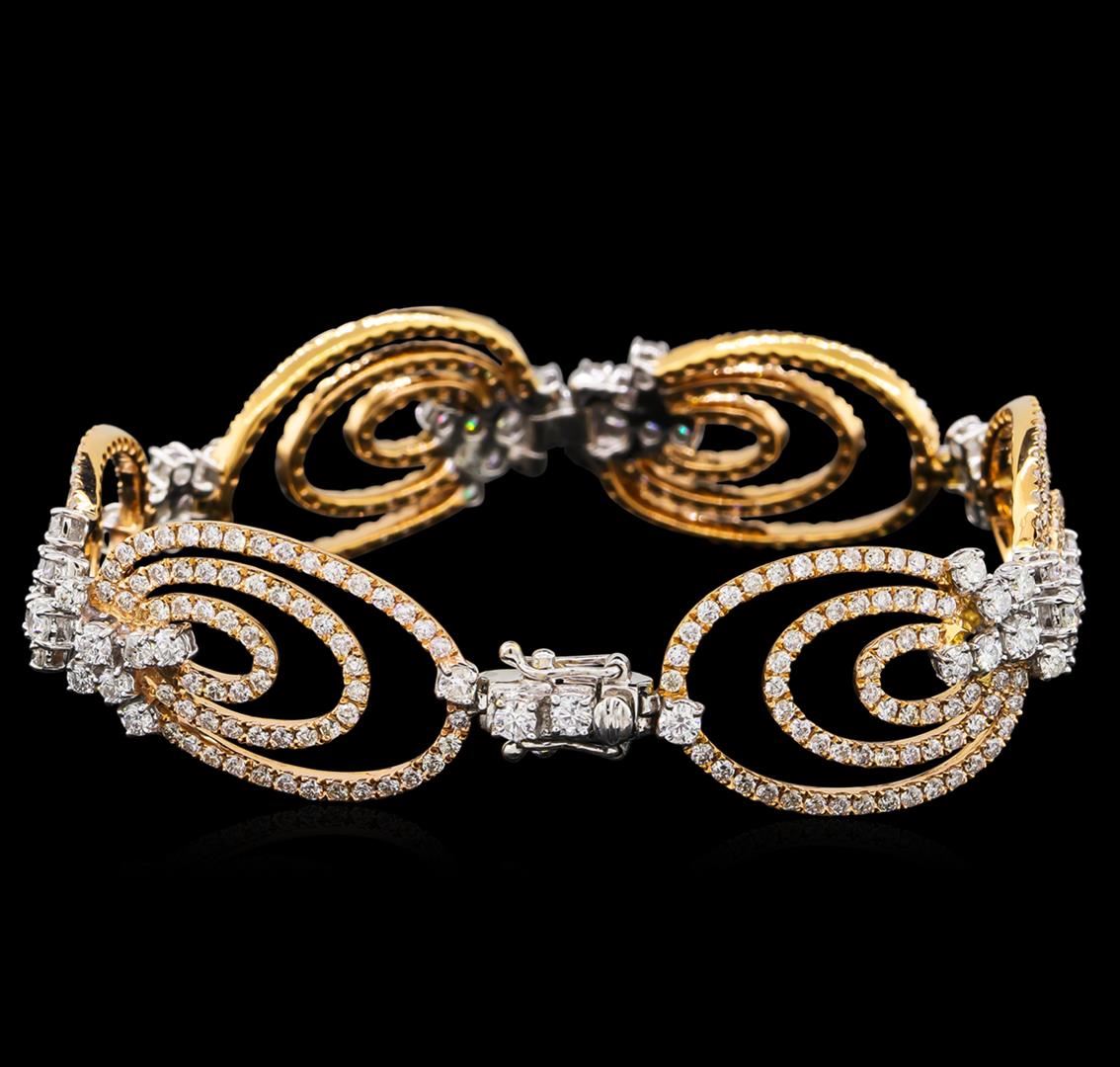 One electronically tested 18KT white gold ladies cast & assembled diamond bracelet. Seven and one-quarter inch length bracelet features stylized diamond hoop links terminating in a concealed clasp with twin safeties. Bright polish finish with rose gold overlay. Identified with markings of "18K 750". Condition is good. Containing: Twenty prong set round brilliant cut diamonds, measuring 2.50 - 2.50 x 1.50mm (depth est.) approximate total weight of 20 Stones = 1.40ct. Graded in the setting. Clarity: SI-2 to I-2. Color: F - G Forty-One prong set round brilliant cut diamonds, measuring 2.30 - 1.90 x 1.26mm (depth est.) approximate total weight of 41 Stones = 1.65ct. Graded in the setting. Clarity: SI-2 to I-2. Color: F - G Three Hundred Seventy-Eight prong set round brilliant cut diamonds, measuring 1.50 - 1.40 x 0.87mm (depth est.) approximate total weight of 378 Stones = 4.51ct. Graded in the setting. Clarity: SI-2 to I-2. Color: F - H. Total Weight of Diamonds 7.56ct. Total Weight of Bracelet 25.34gm. AIG Appraised at $25,020.00.