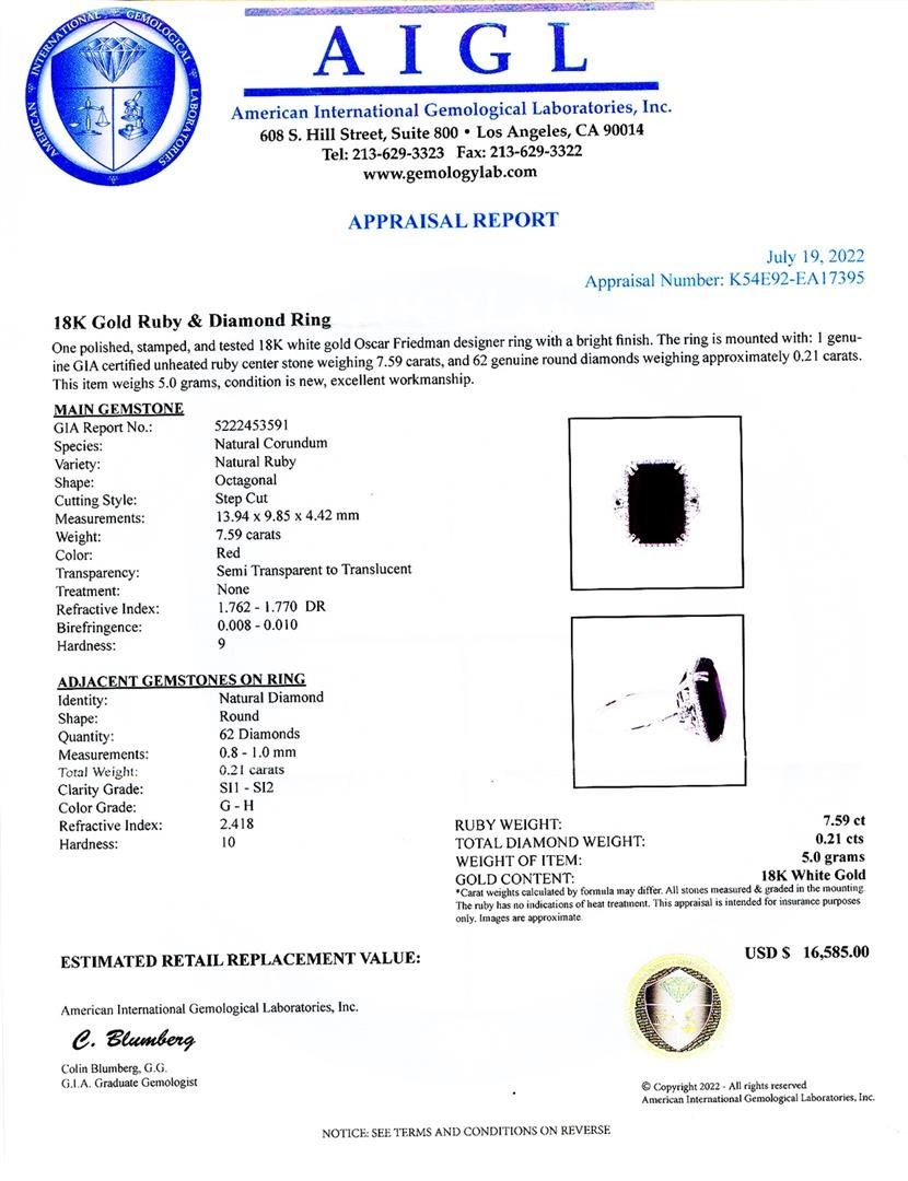 7.59ct UNHEATED Ruby and 0.21ctw Diamond 18K White Gold Ring (GIA CERTIFIED). One polished, stamped, and tested 18K white gold Oscar Friedman designer ring with a bright finish. The ring is mounted with: 1 genuine GIA certified unheated ruby center stone weighing 7.59 carats, and 62 genuine round diamonds weighing approximately 0.21 carats. This item weighs 5.0 grams, condition is new, excellent workmanship. MAIN GEMSTONE GIA Report No.: 5222453591 Species: Natural Corundum Variety: Natural Ruby Shape: Octagonal Cutting Style: Step Cut Measurements: 13.94 x 9.85 x 4.42mm Weight: 7.59 carats Color: Red Transparency: Semi Transparent to Translucent Treatment: None Refractive Index: 1.762 - 1.770 DR Birefringence: 0.008 - 0.010 Hardness: 9 ADJACENT GEMSTONES ON RING Identity: Natural Diamond Shape: Round Quantity: 62 Diamonds Measurements: 0.8 - 1.0mm Total Weight: 0.21 carats Clarity Grade: SI1 to SI2 Color Grade: G - H Refractive Index: 2.418 Hardness: 10 RUBY WEIGHT: 7.59ct TOTAL DIAMOND WEIGHT: 0.21ctw WEIGHT OF ITEM: 5.0 grams GOLD CONTENT: 18K White Gold