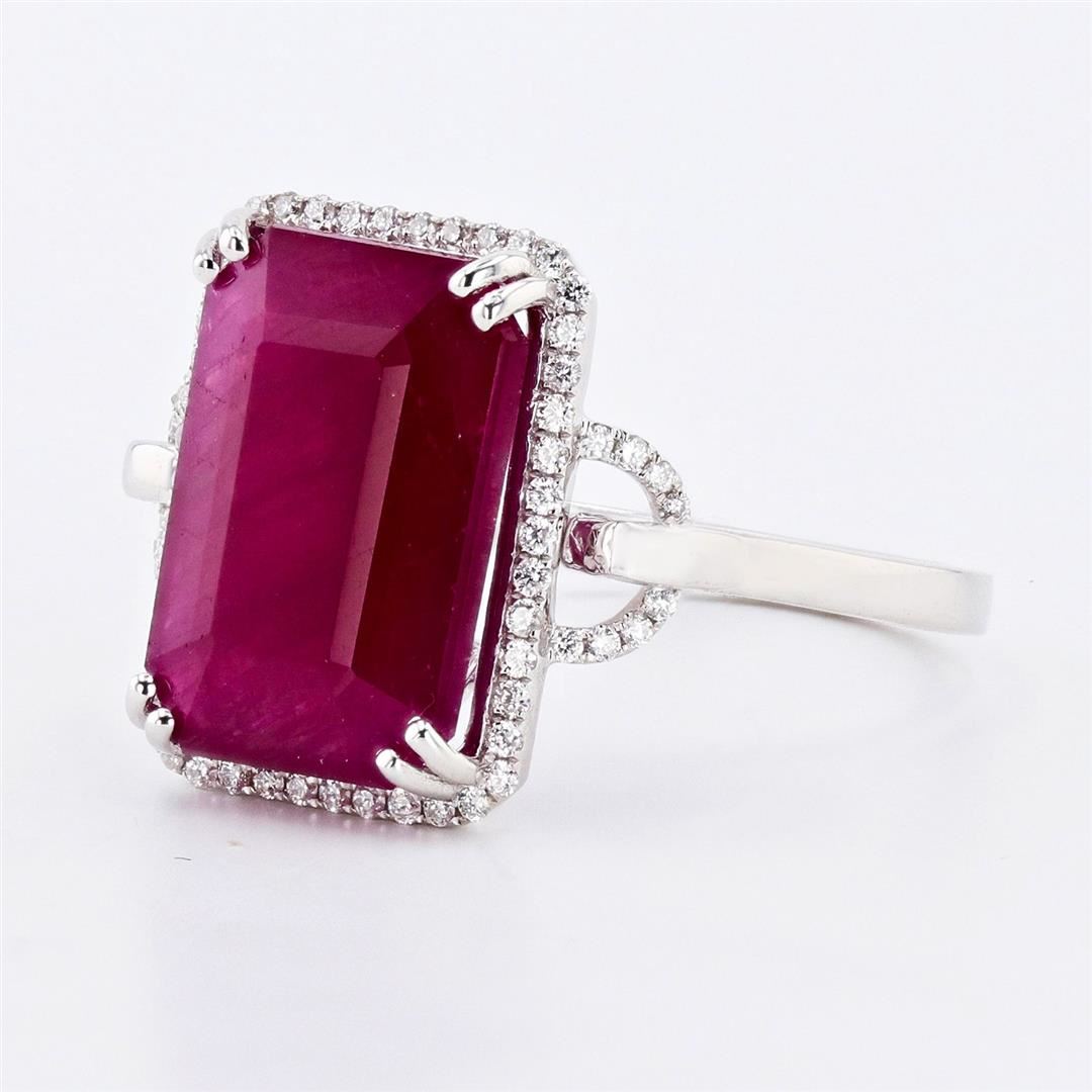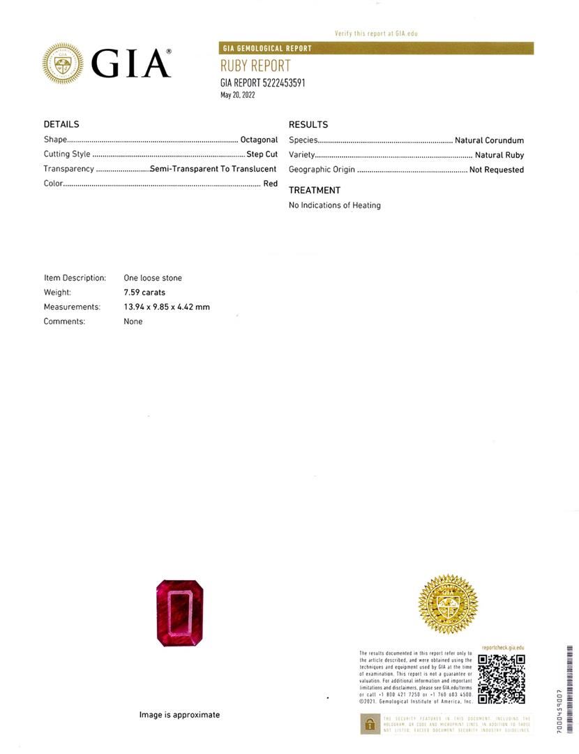 One polished, stamped, and tested 18K white gold Oscar Friedman designer ring with a bright finish. The ring is mounted with: 1 genuine GIA certified unheated ruby center stone weighing 7.59 carats, and 62 genuine round diamonds weighing approximately 0.2