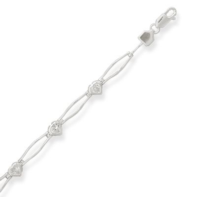 Bracelet features 5mm CZ hearts separated by 18mm open links and a lobster clasp. .925 Sterling Silver