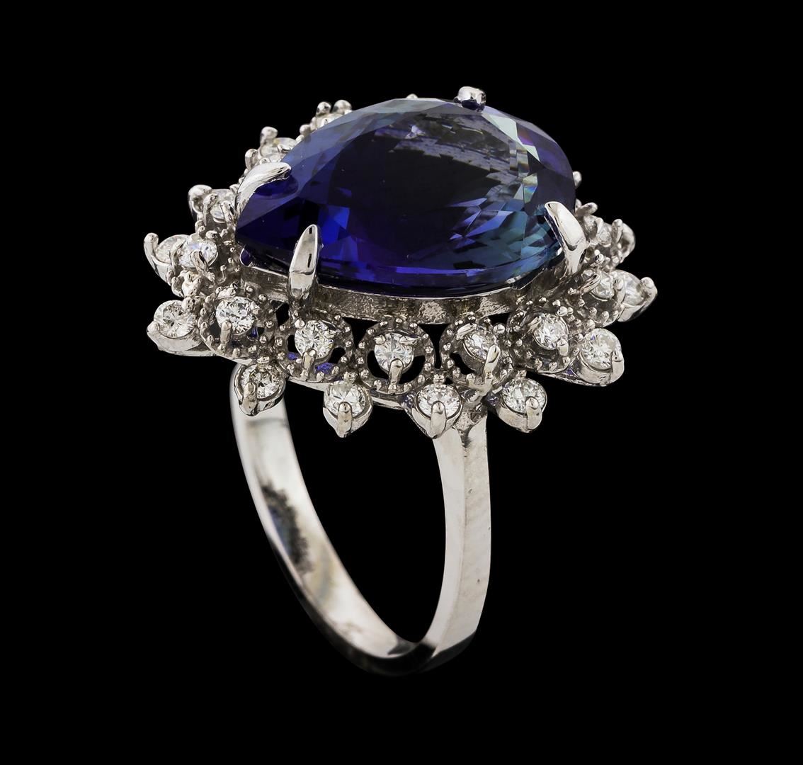 One electronically tested 14KT white gold lady's cast fashion ring with a staggered double basket halo with a bright polish with milgrain detailing finish. The featured lady's ring has a shank measuring 2.27 millimeters wide. Identified with markings of 'K14'. Condition is new, good workmanship. Containing: One prong set pear modified brilliant cut natural tanzanite, measuring 15.55 x 10.85 x 6.67mm, (depth est.) approximate weight of 7.60ct., clarity is eye clean, medium, moderately strong, violetish blue color, (GIA vB 5/4), cut is very good. Transmitting light with no distortion, transparent. Colored gemstones are presumed to have been subjected to commonly used enhancement processes. Graded in the setting. Fourteen prong set round brilliant cut diamonds, measuring 1.90 - 1.80 x 1.11mm (depth est.) approximate total weight of 14 Stones = 0.32ct. Graded in the setting. Clarity SI-1 to SI-3. Color: H - I Cut Good Fourteen prong set round brilliant cut diamonds, measuring 1.70 - 1.60 x 1.02mm (depth est.) approximate total weight of 14 Stones = 0.24ct. Graded in the setting. Clarity SI-1 to SI-2. Color: H - I Cut Good. Total Weight of Colored Stones 7.60ct.. Total Weight of Diamonds 0.56ct.. Total Weight of Ring 6.00gm. GAS Appraised at $12,115.00.