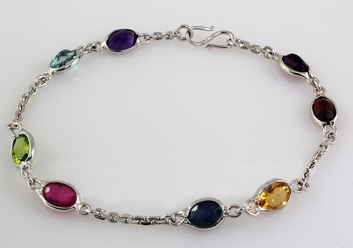 7.61CT Multi Precious Gemstone Silver Bezel Bracelet 2. **|**|** 7.0" Long Natural Multi-color Precious Gemstone in Bezel Design Silver Bracelet; 8pcs 7x5mm ; MSRP: $600