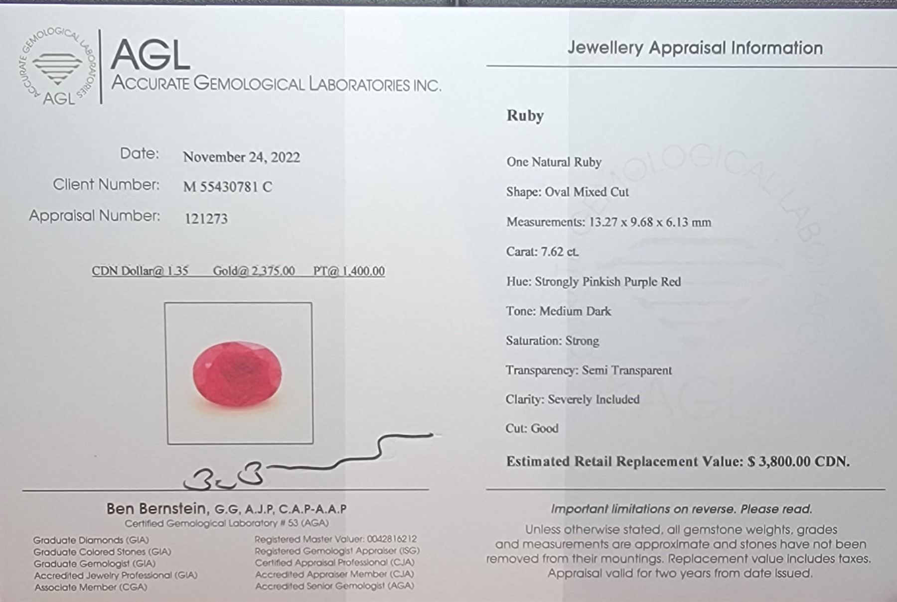$3800 APPRAISAL, OVAL CUT - INCLUDES APPRAISAL CERTIFICATE **ALL ITEMS MUST BE REMOVED BY 5PM SATURDAY, JANUARY 21ST 2023. ALL MAGIC SPACE ITEMS MUST BE REMOVED BY WEDNESDAY, JANUARY 18TH AND ARE LOCATED AT 9058-22 AVENUE SW #102. **ALL REMAINING ITEMS WILL BE SUBJECT TO A $6.00 PER DAY STORAGE CHARGE. ANY ITEMS REMAINING AFTER MONDAY, FEBRUARY 6TH, 2023 WILL BE CONSIDERED FORFEITED. NO REFUNDS WILL BE ISSUED FOR FORFEITED ITEMS. TO SCHEDULE A PICK UP APPOINTMENT CLICK HERE