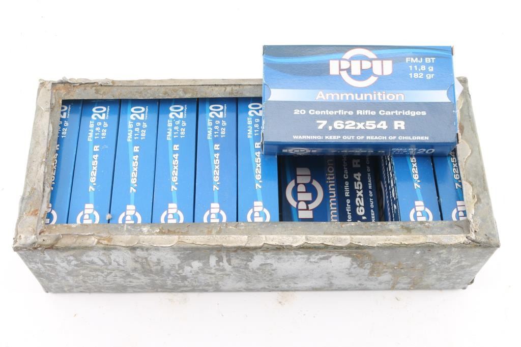 Approx. 200 rounds of 7.62 X 54R factory new ammunition. Made in Serbia by PPU. In 20 rd factory boxes. All in metal tin can.