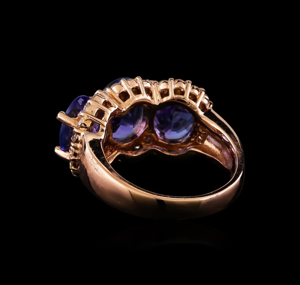 One electronically tested 14KT rose gold ladies cast tanzanite and diamond ring with a bright polish finish. The ring features a tanzanite trio set within a diamond bezel supported by tapering shoulders, completed by a three millimeter wide band. Identified with markings of "K14". Condition is new, good workmanship. Containing: Three prong set oval mixed cut natural tanzanites, measuring 9.50 x 7.30 x 5.20mm, approximate total weight of 7.62ct., clarity is eye clean, type I, medium, slightly grayish, bluish violet color, (GIA bV 5/2), cut is good. Transmitting light with no distortion, transparent. Measurements & the color grade are an average for the group. Graded in the setting. Tanzanite is a very rare gemstone that is only found in the country of Tanzania. Originally discovered in 1967. Tiffany & Company, named the stone Tanzanite. It is found in the Usumburu Mountains that border the Umba Valley of northern Tanzania. Tanzanite occurs in gray, brown, violet, blue, reddish-purple, & green. The gem is interesting because of its exceptional pleochroism. Rotated in different directions a tanzanite will exhibit multiple changes of color. Tanzanite has a low tolerance to ultrasonic cleaning, and should not be cleaned using this method. Thirty-Two prong set round brilliant cut diamonds, measuring 1.80 - 1.80 x 1.08mm (depth est.) approximate total weight of 32 Stones = 0.72ct. Color & clarity grade are an average for the group. Graded in the setting. Clarity: SI-2 to I-1. Color: H - J. Total Weight of Colored Stones 7.62ct. Total Weight of Diamonds 0.72ct. Total Weight of Ring 9.18gm. AIG Appraised at $15,750.00.