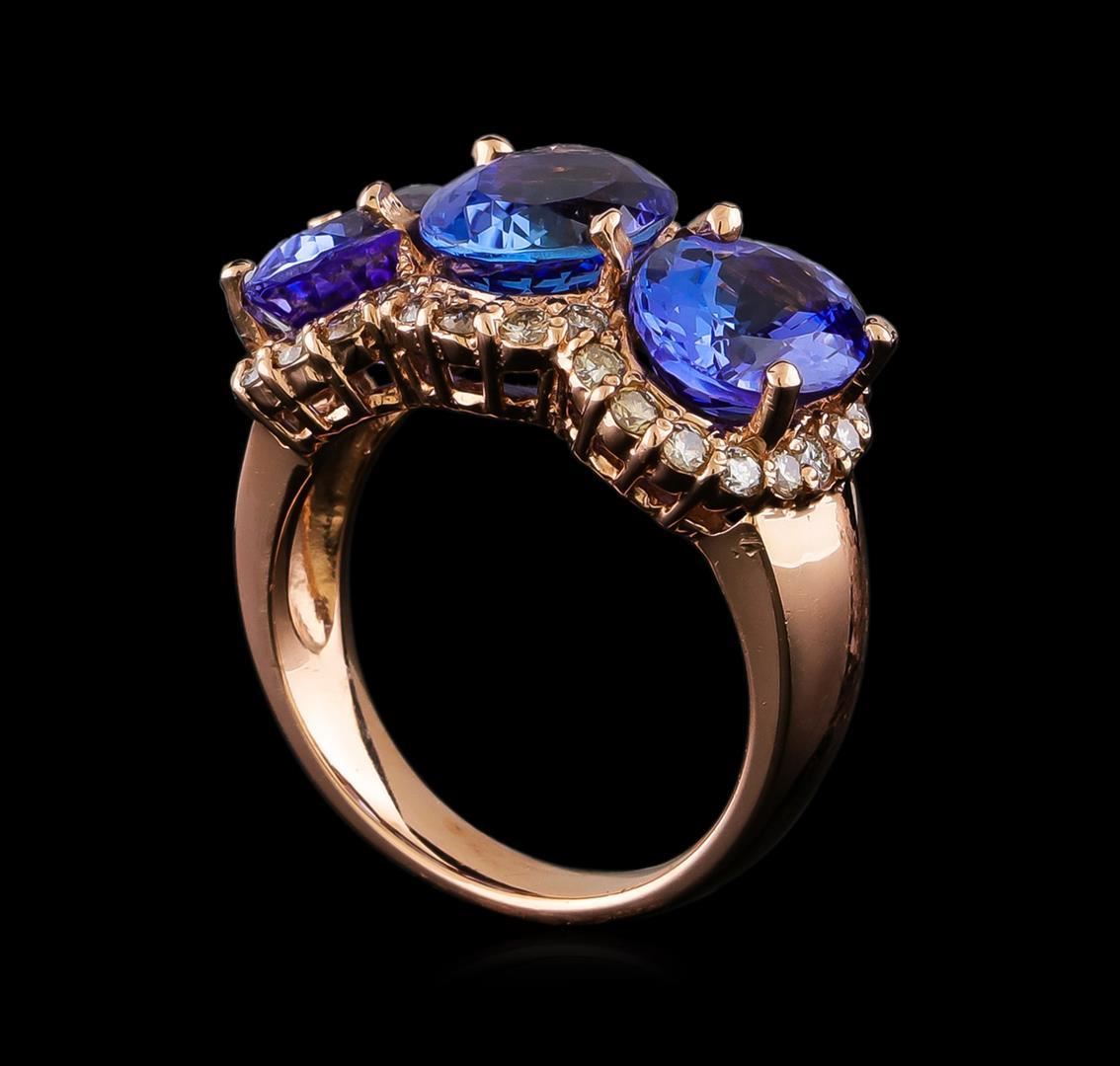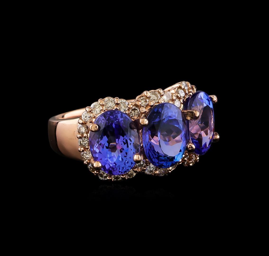 One electronically tested 14KT rose gold ladies cast tanzanite and diamond ring with a bright polish finish. The ring features a tanzanite trio set within a diamond bezel supported by tapering shoulders, completed by a three millimeter wide band. Identified with markings of "K14". Condition is new, good workmanship. Containing: Three prong set oval mixed cut natural tanzanites, measuring 9.50 x 7.30 x 5.20mm, approximate total weight of 7.62ct., clarity is eye clean, type I, medium, slightly grayish, bluish violet color, (GIA bV 5/2), cut is good. Transmitting light with no distortion, transparent. Measurements & the color grade are an average for the group. Graded in the setting. Tanzanite is a very rare gemstone that is only found in the country of Tanzania. Originally discovered in 1967. Tiffany & Company, named the stone Tanzanite. It is found in the Usumburu Mountains that border the Umba Valley of northern Tanzania. Tanzanite occurs in gray, brown, violet, blue, reddish-purple, & green. The gem is interesting because of its exceptional pleochroism. Rotated in different directions a tanzanite will exhibit multiple changes of color. Tanzanite has a low tolerance to ultrasonic cleaning, and should not be cleaned using this method. Thirty-Two prong set round brilliant cut diamonds, measuring 1.80 - 1.80 x 1.08mm (depth est.) approximate total weight of 32 Stones = 0.72ct. Color & clarity grade are an average for the group. Graded in the setting. Clarity: SI-2 to I-1. Color: H - J. Total Weight of Colored Stones 7.62ct. Total Weight of Diamonds 0.72ct. Total Weight of Ring 9.18gm. AIG Appraised.