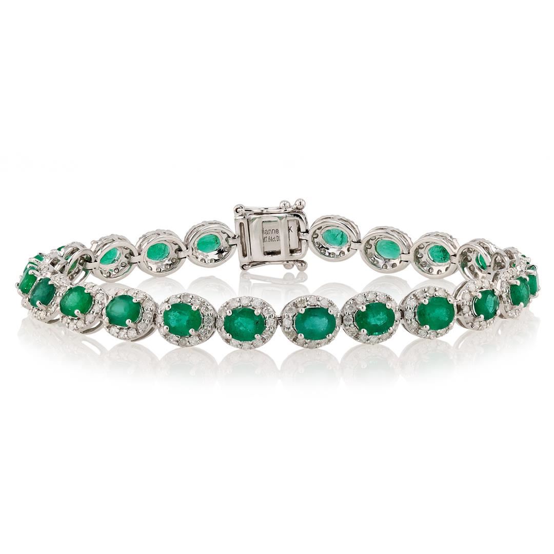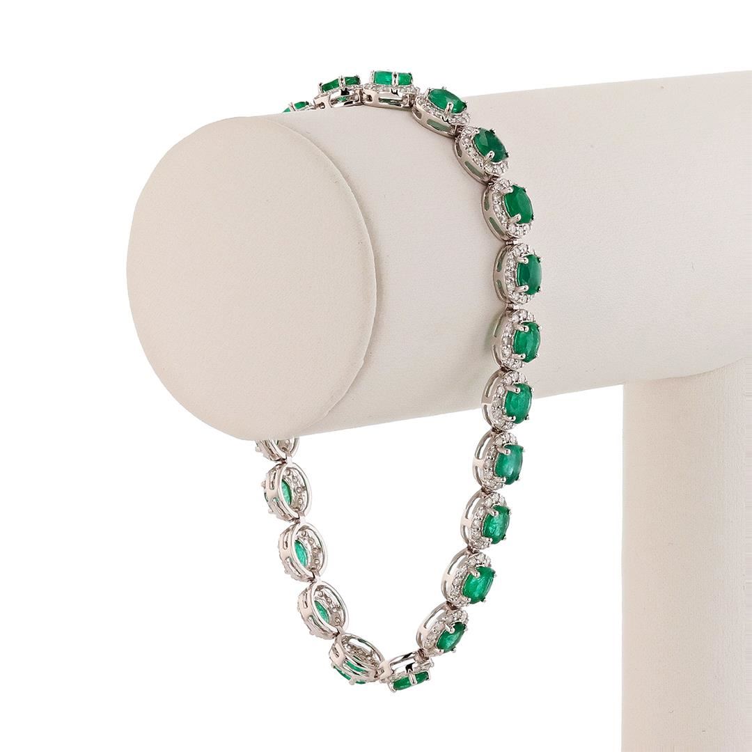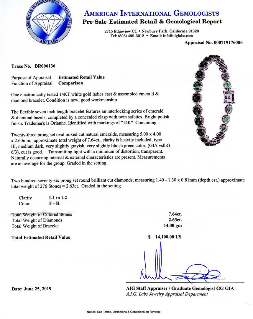 One electronically tested 14KT white gold ladies cast and assembled emerald and diamond bracelet. Condition is new, good workmanship. The flexible seven inch length bracelet features an interlocking series of emerald and diamond bezels, completed by a concealed clasp with twin safeties. Bright polish finish. Trademark is Orianne. Identified with markings of "14K" Containing: Twenty-three prong set oval mixed cut natural emeralds, measuring 5.00 x 4.00 x 2.60mm, approximate total weight of 7.64ct., clarity is heavily included, type III, medium dark, very slightly grayish, very slightly bluish green color, (GIA vslbG 6/3), cut is good. Transmitting light with a minimum of distortion, transparent. Naturally occurring internal and external characteristics are present. Measurements are an average for the group. Graded in the setting. Two hundred seventy-six prong set round brilliant cut diamonds, measuring 1.40 - 1.30 x 0.81mm (depth est.) approximate total weight of 276 Stones = 2.63ct. Graded in the setting. Clarity I-1 to I-2 Color F-H Total Weight of Colored Stones 7.64ct. Total Weight of Diamonds 2.63ct. Total Weight of Bracelet 14.00 gm
